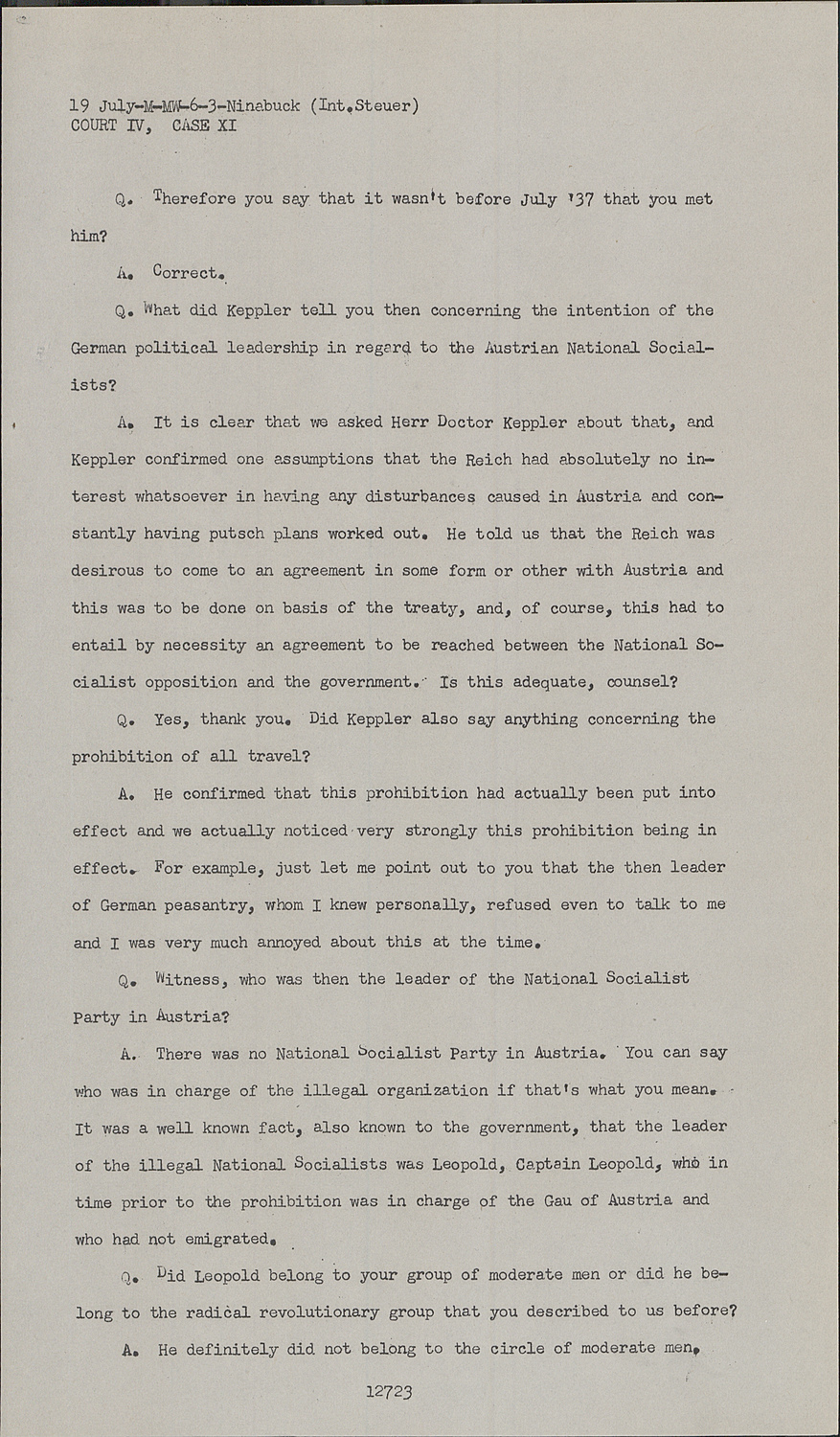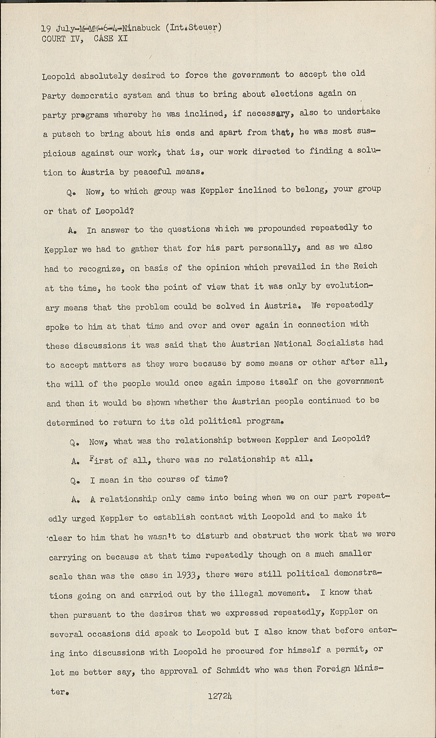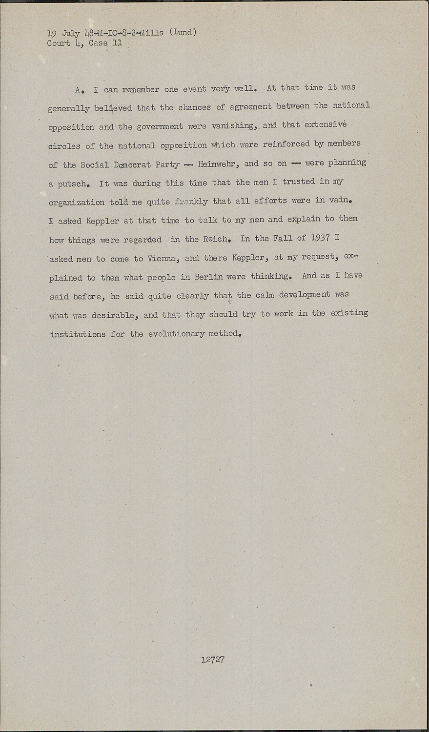 A.I can remember one event very well. At that time it was generally believed that the chanced of agreement between the national opposition and the government were vanishing, and that extensive circles of the national opposition which were reinforced by member of the Social Democrat Party -- Heimwehr, and so on -- were planning a putsch. It was during this time that the men I trusted in my organization told me quite frankly that all efforts were in vain. I asked Keppler at that time to talk to my men and explain to them how things were regarded in the Reich. In the Fall of 1937 I asked men to come to Vienna, and there Keppler, at my request, explained to them what people in Berlin were thinking. And as I have said before, he said quite clearly that the calm development was what was desirable, and that they should try to work in the existing institutions for the evolutionary method.