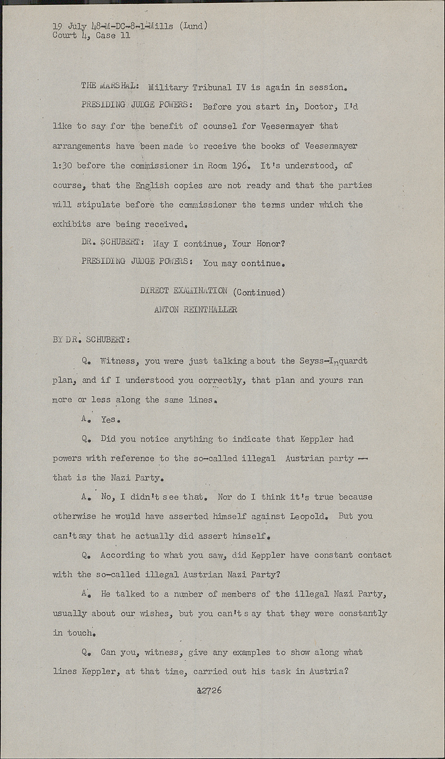 PRESIDING JUDGE POWERS:Before you start in, Doctor, I'd like to say for the benefit of counsel for Veesenmayer that arrangements have been made to receive the books of Veesenmayer 1:30 before the commissioner in Room 196. It's understood, of course, that the English copies are not ready and that the parties will stipulate before the commissioner the terms under which the exhibits are being received.