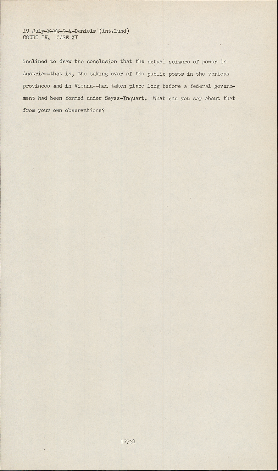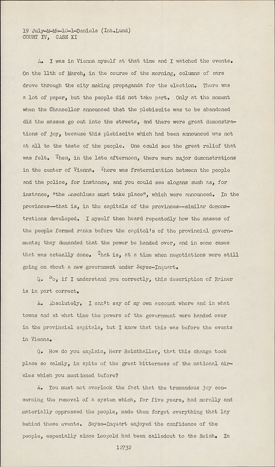 Q.I would now like to come briefly to the events of the 11th of March 1938. The remarks made by the former Gauleiter Rainer in Prosecution Exhibit 32 in Book 2, on page 141 of the English, one may be inclined to draw the conclusion that the actual seizure of power in Austria--that is, the taking over of the public posts in the various provinces and in Vienna-had taken place long before a federal government had been formed under Seyss-Inquart.