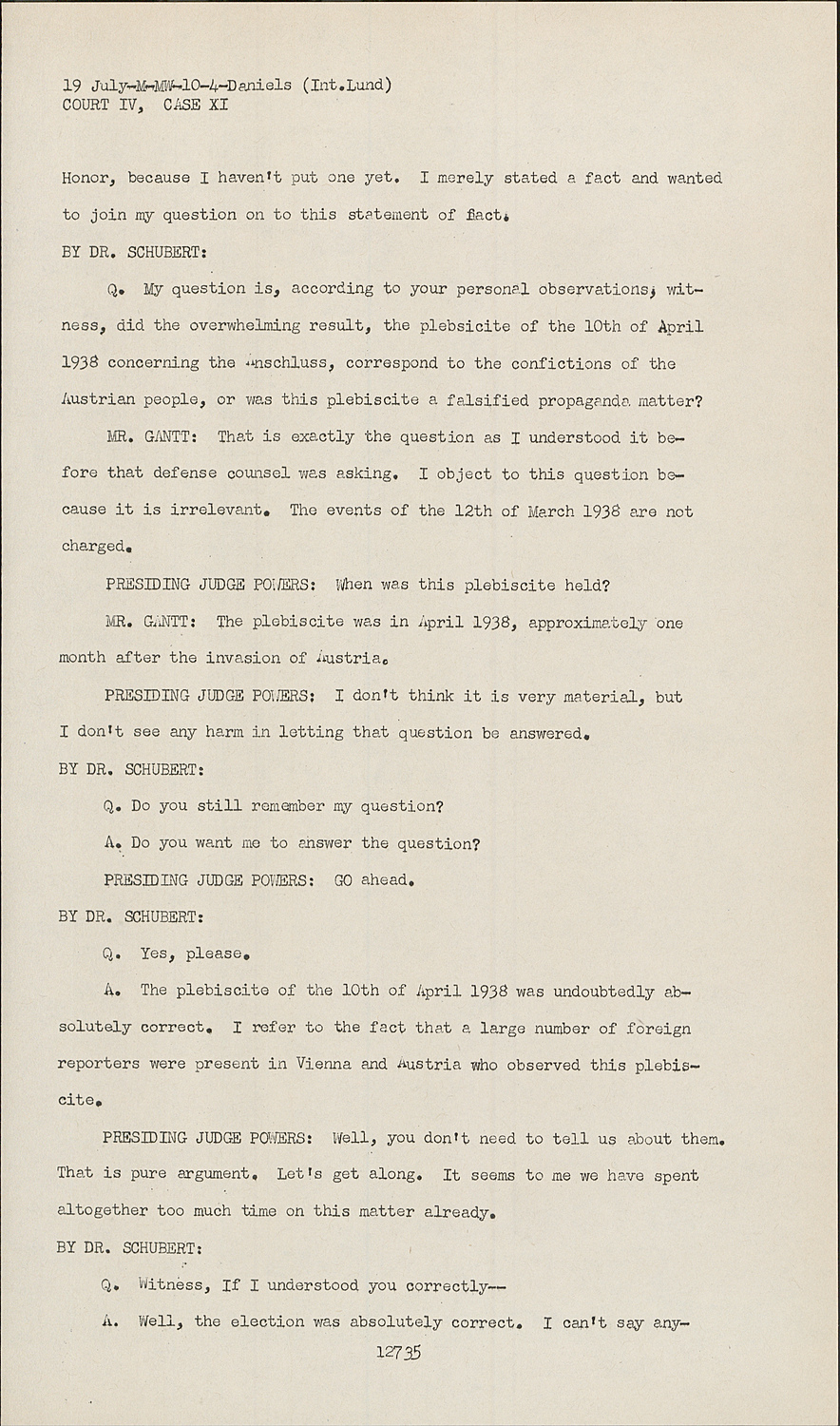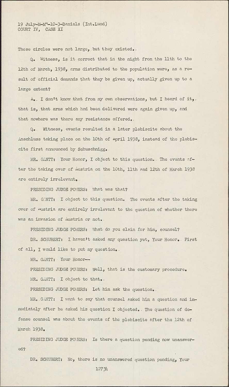 MR. GANTT:Your Honor, I object to this question. The events after the taking over of Austria on the 10th, 11th and 12th of March 1938 are entirely irrelevant.