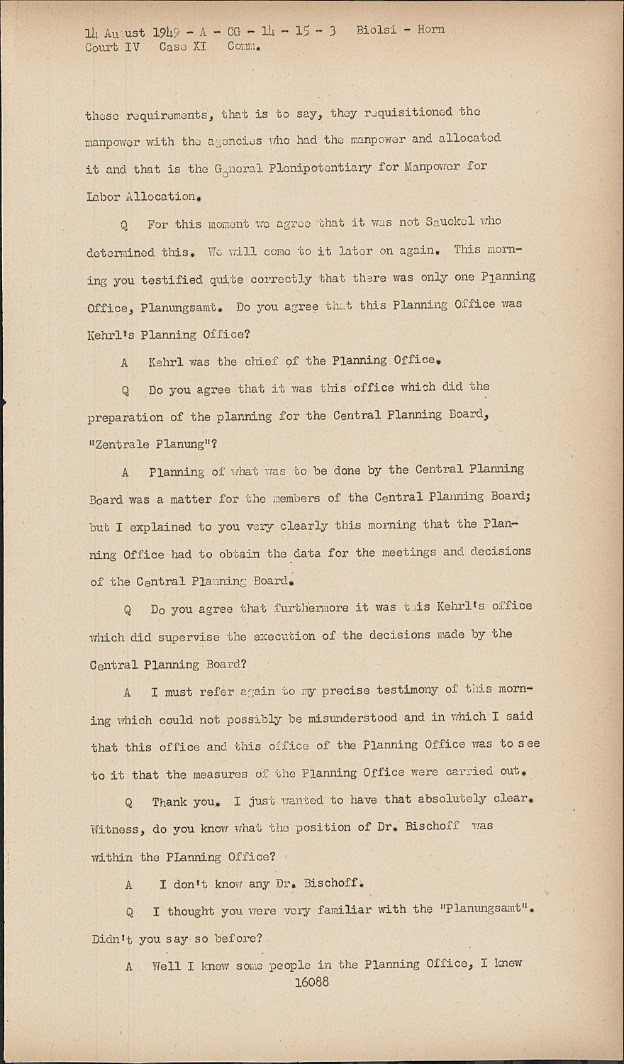 QFor this moment we agree that it was not Sauckel who determined this. We will come to it later on again. This morning you testified quite correctly that there was only one Planning Office, Planungsamt. Do you agree that this Planning Office was Kehrl's Planning Office?