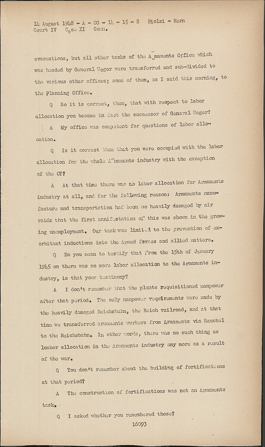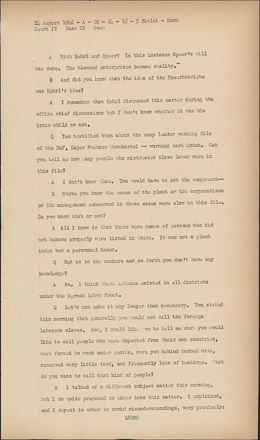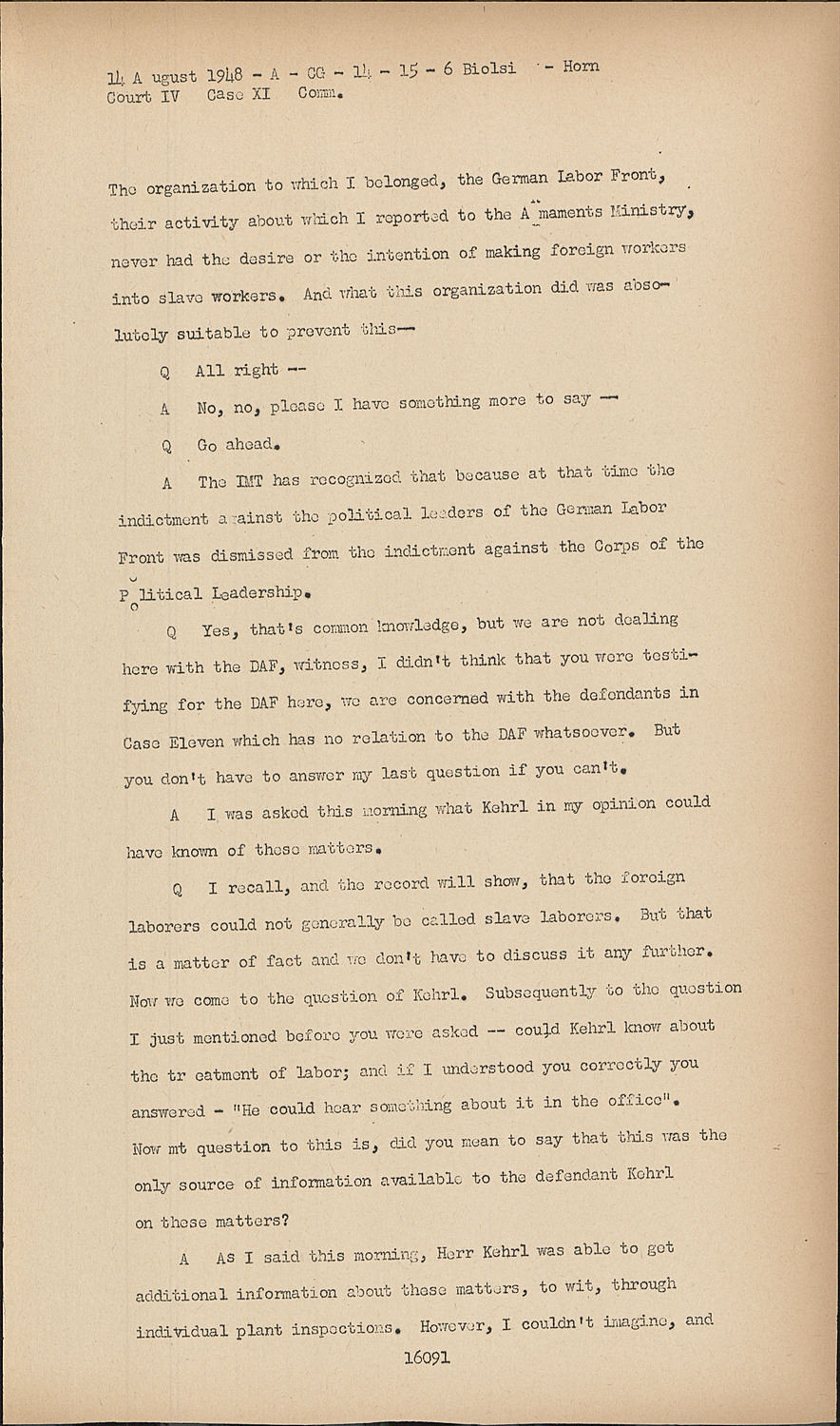 14 A ugust 1948 - A - CG - 14 - 15 - 6 Biolsi - Horn The organization to which I belonged, the German Labor Front, their activity about which I reported to the Armaments Ministry, never had the desire or the intention of making foreign workers into slave workers. And what this organization did was absolutely suitable to prevent this