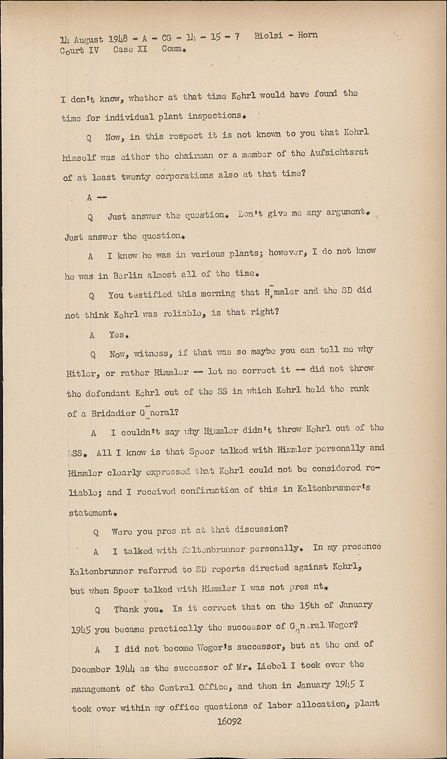 QI recall, and the record will show, that the foreign laborers could not generally be called slave laborers. But that is a matter of fact and we don't have to discuss it any further. Now we come to the question of Kehrl. Subsequently to the question I just mentioned before you were asked -- could Kehrl know about the tr eatment of labor; and if I understood you correctly you answered - "He could hear something about it in the office". Now mt question to this is, did you mean to say that this was the only source of information available to the defendant Kehrl on these matters?
