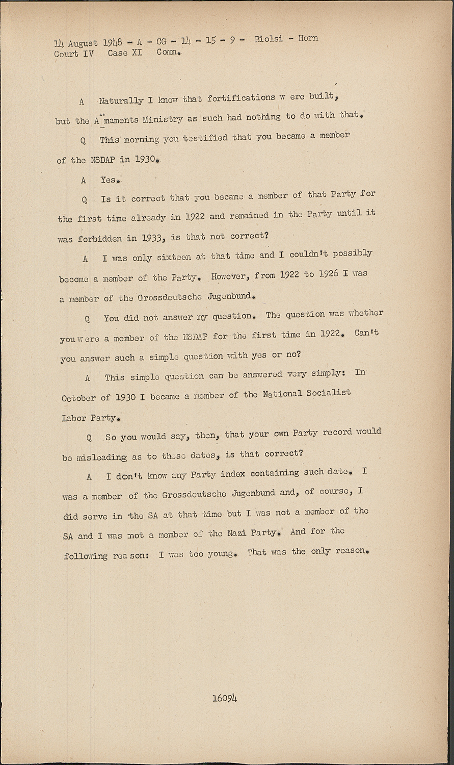AI don't know any Party index containing such date. I was a member of the Grossdeutsche Jugenbund and, of course, I did serve in the SA at that time but I was not a member of the SA and I was mot a member of the Nazi Party. And for the following reason: I was too young. That was the only reason.