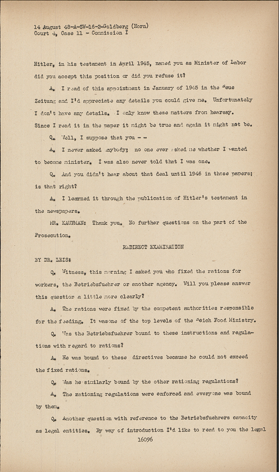 Q.Now, then, I have a last question. Maybe you know that. When Court 4, Case 11 - Commission I Hitler, in his testament in April 1945, named you as Minister of Labor did you accept this position or did you refuse it?