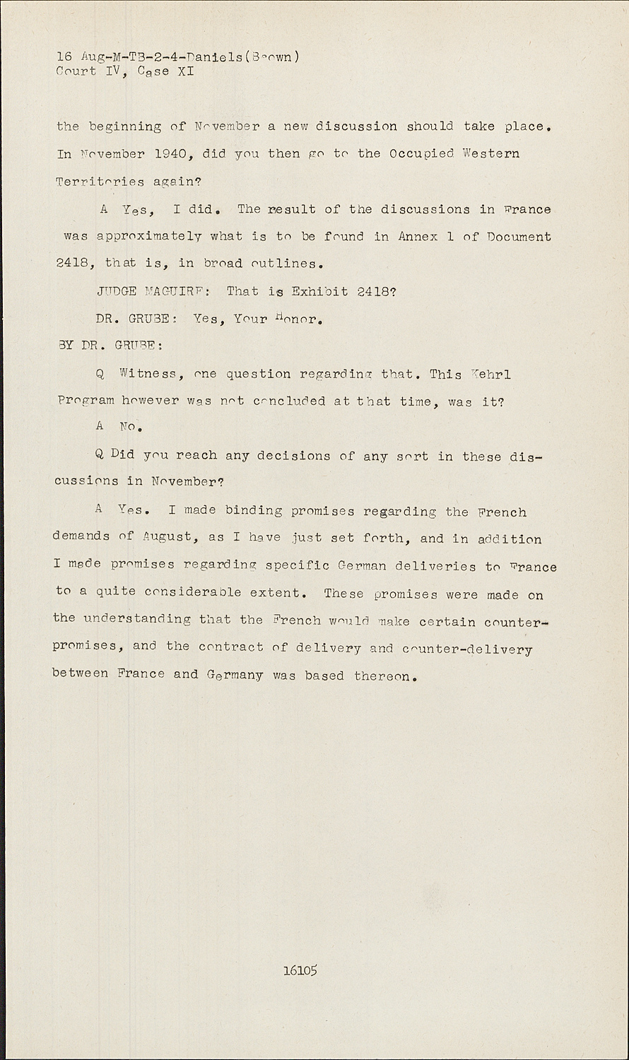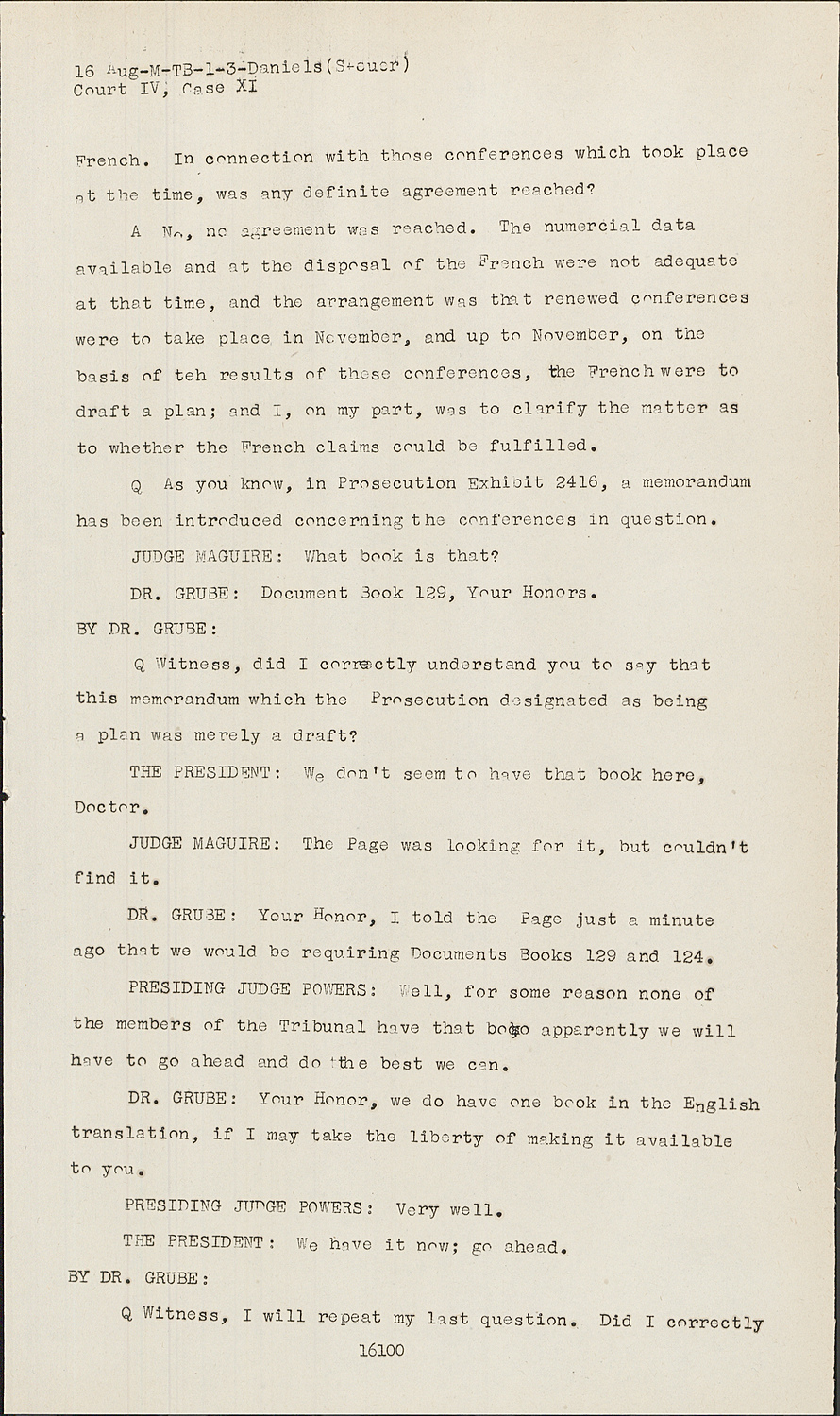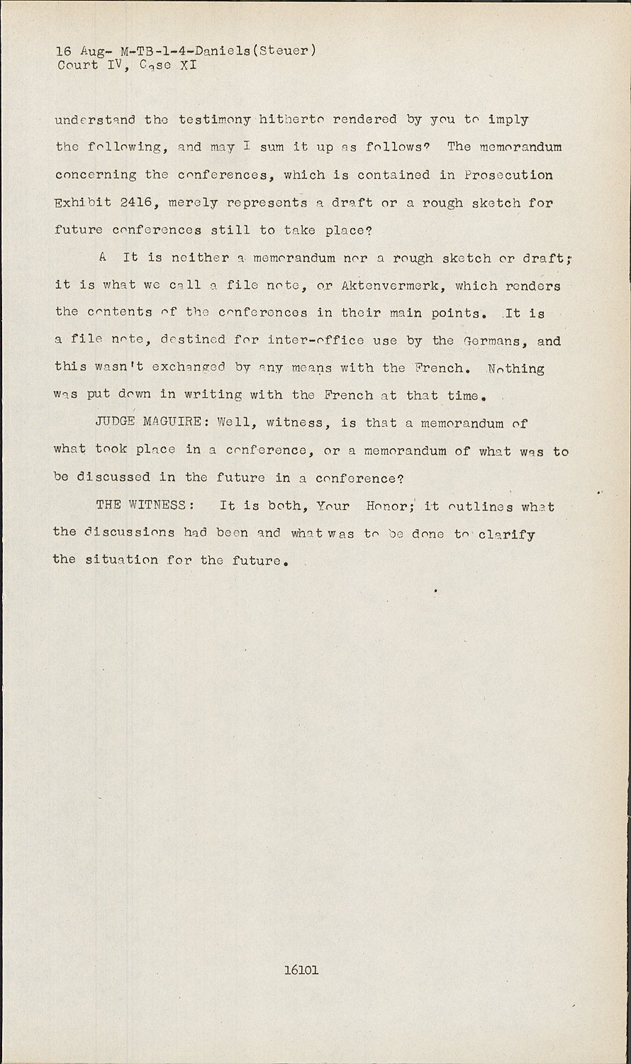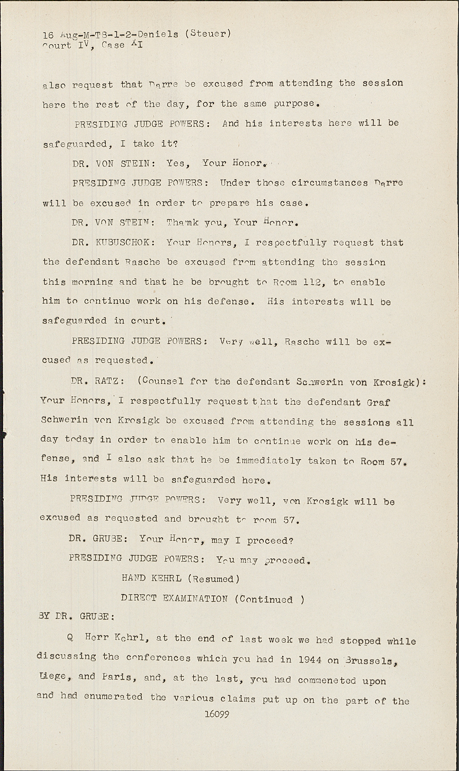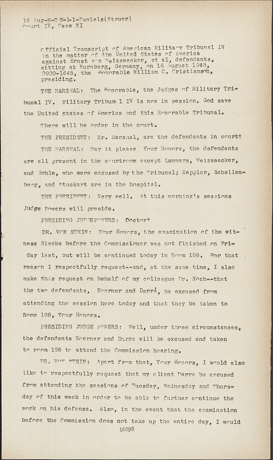 Official Transcript of American Military Tribunal IV in the matter of the United States of America against Ernst von Weizsaecker, et al, defendants, sitting at Nurnberg, Germany, on 16 August 1948, 0900-1645, the honorable William C. Cristianson, presiding.