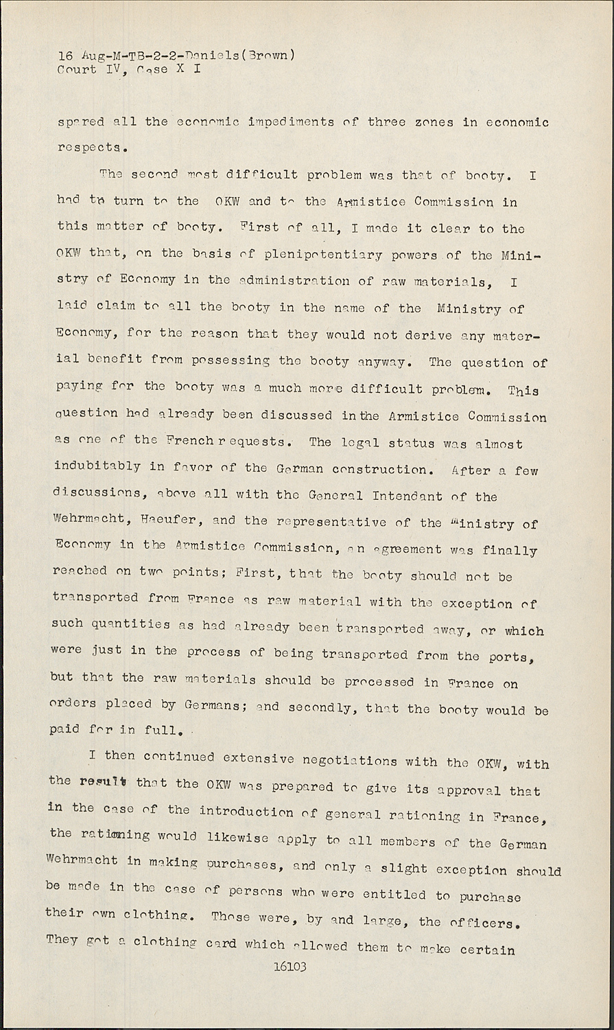 I then continued extensive negotiations with the OKW, with the result that the OKW was prepared to give its approval that in the case of the introduction of general rationing in France, the rationing would likewise apply to all members of the German Wehrmacht in making purchases, and only a slight exception should be made in the case of persons who were entitled to purchase their own clothing. Those were, by and large, the officers. They got a clothing card which allowed them to make certain purchases in France.