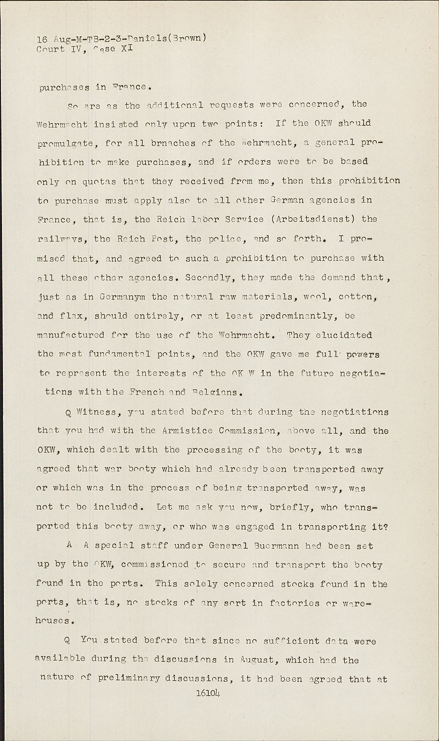 So are as the additional requests were concerned, the Wehrmacht insisted only upon two points: If the OKW should promulgate, for all branches of the Wehrmacht, a general prohibition to make purchases, and if orders were to be based only on quotas that they received from me, then this prohibition to purchase must apply also to all other German agencies in France, that is, the Reich labor Service (Arbeitsdienst) the railways, the Reich Post, the police, and so forth. I promised that, and agreed to such a prohibition to purchase with all these other agencies. Secondly, they made the demand that, just as in Germanym the natural raw materials, wool, cotton, and flax, should entirely, or at least predominantly, be manufactured for the use of the Wehrmacht. They elucidated the most fundamental points, and the OKW gave me full powers to represent the interests of the OK W in the future negotia tions with the French and Belgians.