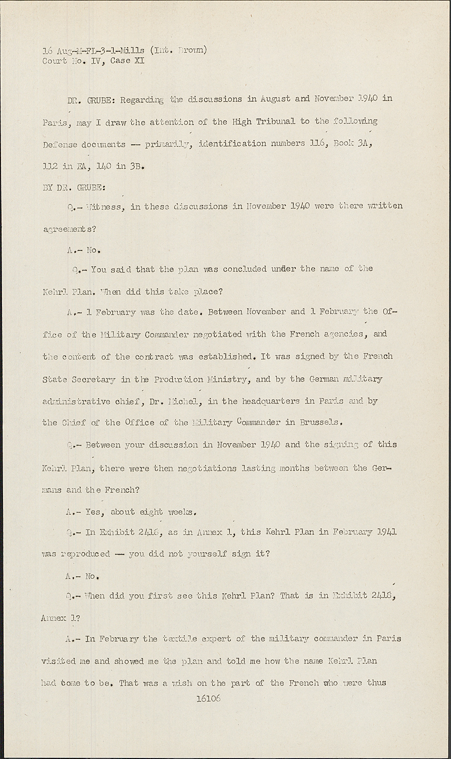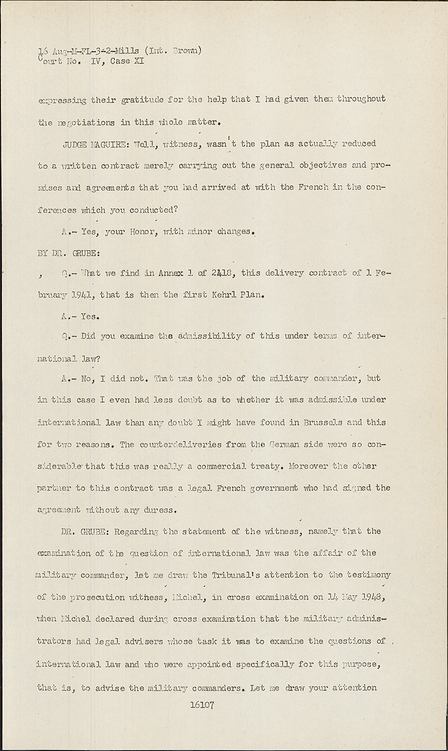 DR. GRUBE:Regarding the statement of the witness, namely that the examination of the question of international law was the affair of the military commander, let me draw the Tribunal's attention to the testimony of the prosecution witness, Michel, in cross examination on 14 May 1948, when Michel declared during cross examination that the military administrators had legal advisers whose task it was to examine the questions of international law and who were appointed specifically for this purpose, that is, to advise the military commanders. Let me draw your attention further to my Document Identification number 126 in book 3A. This is an affidavit to my document identification number 126 in Book 3A. This is an affidavit by Weniger who corroborates these statements.