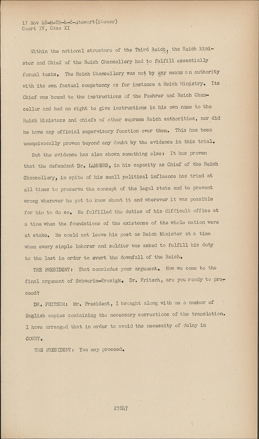 THE PRESIDENT:That concludes your argument. Now we come to the final argument of Schwerin-Krosigk. Dr. Fritsch, are you ready to proceed?