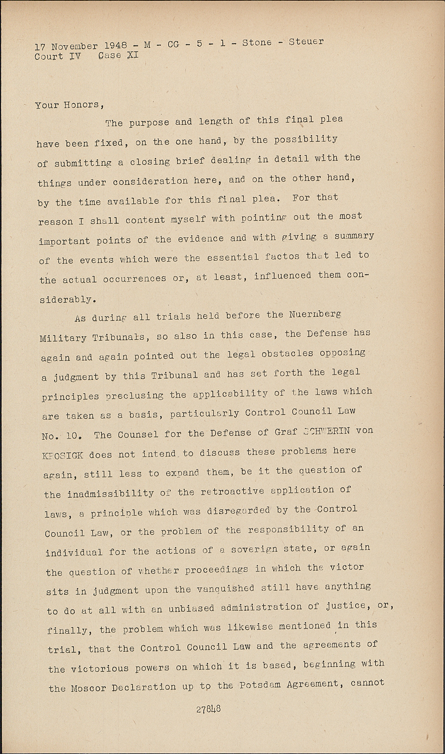 As during all trials held before the Nuernberg Military Tribunals, so also in this case, the Defense has again and again pointed out the legal obstacles opposing a judgment by this Tribunal and has set forth the legal principles preclusing the applicability of the laws which are taken as a basis, particularly Control Council Law No. 10. The Counsel for the Defense of Graf SCHWERIN von KPOSIGK does not intend to discuss these problems here again, still less to expand them, be it the question of the inadmissibility of the retroactive application of laws, a principle which was disregarded by the Control Council Law, or the problem of the responsibility of an individual for the actions of a soverign state, or again the question of whether proceedings in which the victor sits in judgment upon the vanquished still have anything to do at all with an unbiased administration of justice, or, finally, the problem which was likewise mentioned in this trial, that the Control Council Law and the agreements of the victorious powers on which it is based, beginning with the Moscor Declaration up to the Potsdam Agreement, cannot be taken as a legal foundation, if only for the reason that mong the partners to these various agreements there were powers which themselves participated in the alledgedly criminal acts which are under discussion here.