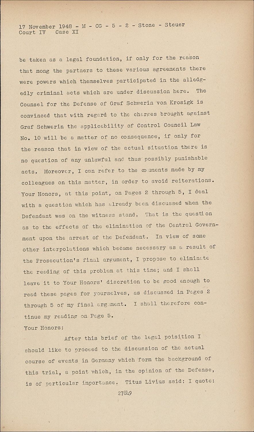 The Counsel for the Defense of Graf Schwerin von Krosigk is convinced that with regard to the charges brought against Graf Schwerin the applicability of Control Council Law No. 10 will be a matter of no consequence, if only for the reason that in view of the actual situation there is no question of any unlawful and thus possibly punishable acts. Moreover, I can refer to the comments made by my colleagues on this matter, in order to avoid reiterations. Your Honors, at this point, on Pages 2 through 5, I deal with a question which has already been discussed when the Defendant was on the witness stand. That is the question as to the effects of the elimination of the Central Government upon the arrest of the Defendant. In view of some other interpolations which became necessary as a result of the Prosecution's final argument, I propose to eliminate the reading of this problem at this time; and I shall leave it to Your Honors' discretion to be good enough to read these pages for yourselves, as discussed in Pages 2 through 5 of my final argument. I shall therefore continue my reading on Page 5. Your Honors: