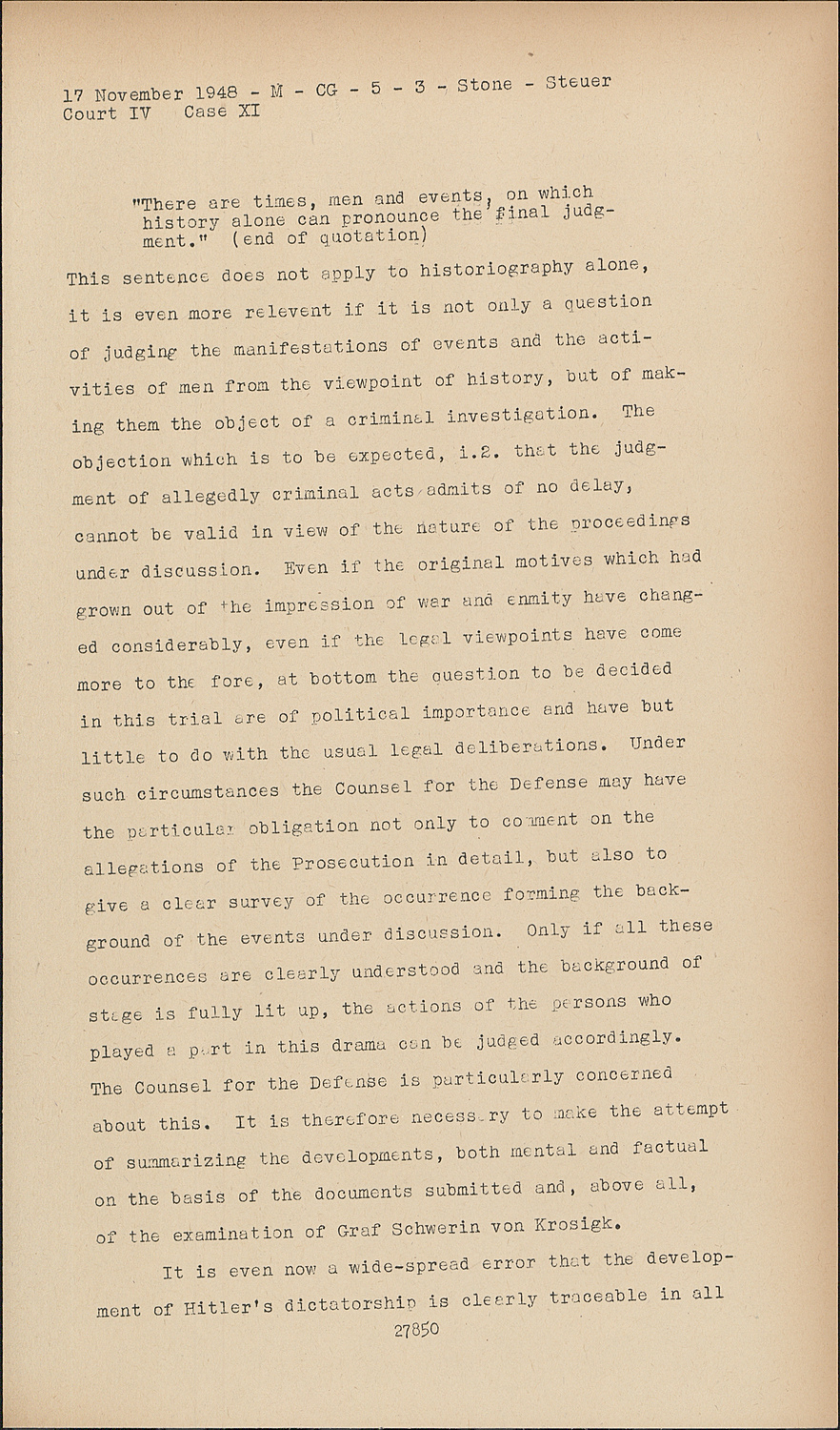(end of quotation) This sentence does not apply to historiography alone, it is even more relevent if it is not only a question of judging the manifestations of events and the activities of men from the viewpoint of history, but of making them the object of a criminal investigation. The objection which is to be expected, i.2. that the judgment of allegedly criminal acts admits of no delay, cannot be valid in view of the nature of the proceedings under discussion. Even if the original motives which had grown out of the impression of war and enmity have changed considerably, even if the legal viewpoints have come more to the fore, at bottom the question to be decided in this trial are of political importance and have but little to do with the usual legal deliberations. Under such circumstances the Counsel for the Defense may have the particular obligation not only to comment on the allegations of the Prosecution in detail, but also to give a clear survey of the occurrence forming the background of the events under discussion. Only if all these occurrences are clearly understood and the background of stage is fully lit up, the actions of the persons who played a part in this drama can be judged accordingly. The Counsel for the Defense is particularly concerned about this. It is therefore necessary to make the attempt of summarizing the developments, both mental and factual on the basis of the documents submitted and, above all, of the examination of Graf Schwerin von Krosigk.