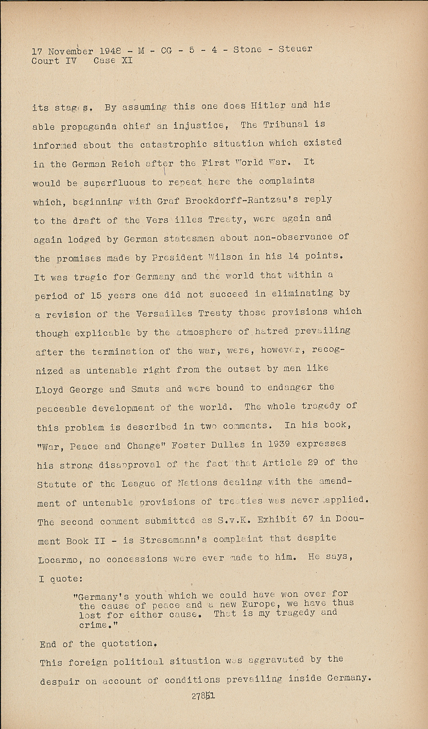 By assuming this one does Hitler and his able propaganda chief an injustice. The Tribunal is informed about the catastrophic situation which existed in the German Reich after the First World War. It would be superfluous to repeat here the complaints which, beginning with Graf Brockdorff-Rantzau's reply to the draft of the Vers illes Treaty, were again and again lodged by German statesmen about non-observance of the promises made by President Wilson in his 14 points. It was tragic for Germany and the world that within a period of 15 years one did not succeed in eliminating by a revision of the Versailles Treaty those provisions which though explicable by the atmosphere of hatred prevailing after the termination of the war, were, however, recognized as untenable right from the outset by men like Lloyd George and Smuts and were bound to endanger the peaceable development of the world. The whole tragedy of this problem is described in two comments. In his book, "War, Peace and Change" Foster Dulles in 1939 expresses his strong disapproval of the fact that Article 29 of the Statute of the League of Nations dealing with the amendment of untenable provisions of treaties was never applied. The second comment submitted as S.v.K. Exhibit 67 in Document Book II - is Stresemann's complaint that despite Locarmo, no concessions were ever made to him. He says, I quote: