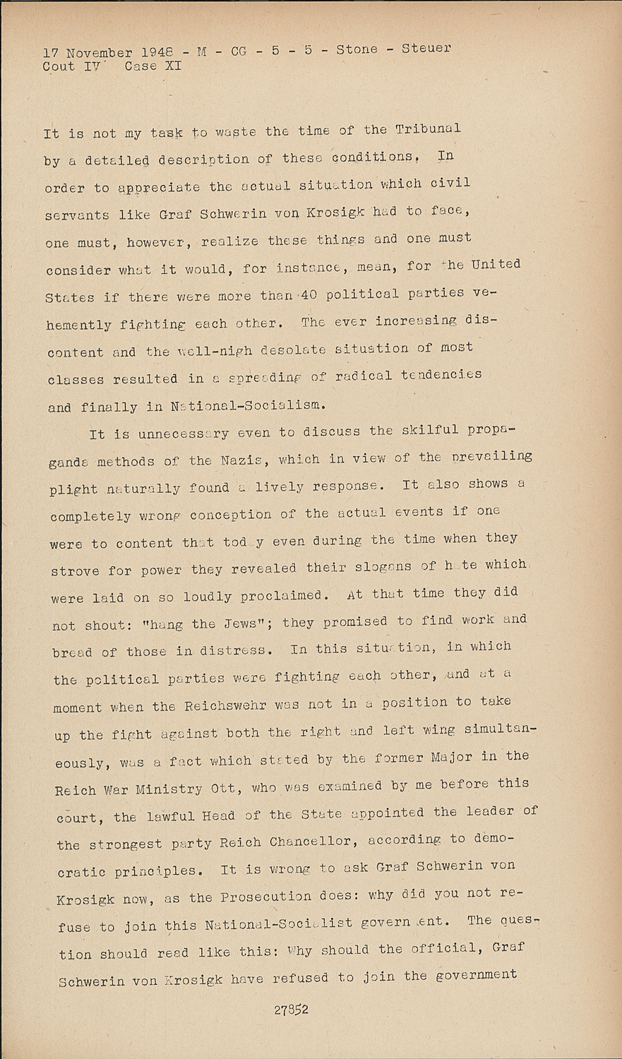 It is unnecessary even to discuss the skilful propaganda methods of the Nazis, which in view of the prevailing plight naturally found a lively response. It also shows a completely wrong conception of the actual events if one were to content that tod y even during the time when they strove for power they revealed their slogans of hate which were laid on so loudly proclaimed. At that time they did not shout: "hang the Jews"; they promised to find work and bread of those in distress. In this situation, in which the political parties were fighting each other, and at a moment when the Reichswehr was not in a position to take up the fight against both the right and left wing simultaneously, was a fact which stated by the former Major in the Reich War Ministry Ott, who was examined by me before this court, the lawful Head of the State appointed the leader of the strongest party Reich Chancellor, according to democratic principles. It is wrong to ask Graf Schwerin von Krosigk now, as the Prosecution does: why did you not refuse to join this National-Socialist government. The question should read like this: Why should the official, Graf Schwerin von Krosigk have refused to join the government at that moment?