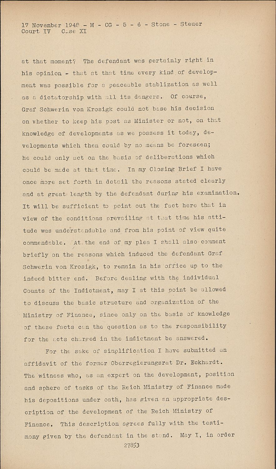 The defendant was certainly right in his opinion - that at that time every kind of development was possible for a peaceable stablization as well as a dictatorship with all its dangers. Of course, Graf Schwerin von Krosigk could not base his decision on whether to keep his post as Minister or not, on that knowledge of developments as we possess it today, developments which then could by no means be foreseen; he could only act on the basis of deliberations which could be made at that time. In my Closing Brief I have once more set forth in detail the reasons stated clearly and at great length by the defendant during his examination. It will be sufficient to point out the fact here that in view of the conditions prevailing at that time his attitude was understandable and from his point of view quite commendable. At the end of my plea I shall also comment briefly on the reasons which induced the defendant Graf Schwerin von Krosigk, to remain in his office up to the indeed bitter end. Before dealing with the individual Counts of the Indictment, may I at this point be allowed to discuss the basic structure and organization of the Ministry of Finance, since only on the basis of knowledge of these facts can the question as to the responsibility for the acts charged in the indictment be answered.