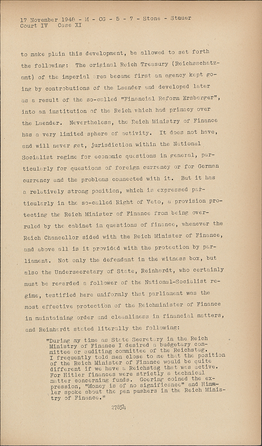 The original Reich Treasury (Reichsschatzamt) of the imperial area became first an agency kept going by controbutions of the Laender and developed later as a result of the so-called "Financial Reform Ersberger", into an institution of the Reich which had primacy over the Laender. Nevertheless, the Reich Ministry of Finance has a very limited sphere of activity. It does not have, end will never get, jurisdiction within the National Socialist regime for economic questions in general, particularly for questions of foreign currency or for German currency and the problems connected with it. But it has a relatively strong position, which is expressed particularly in the so-called Right of Veto, a provision protecting the Reich Minister of Finance from being overruled by the cabinet in questions of finance, whenever the Reich Chancellor sided with the Reich Minister of Finance, and above all is it provided with the protection by parliament. Not only the defendant in the witness box, but also the Undersecretary of State, Reinhardt, who certainly must be regarded a follower of the National-Socialist regime, testified here uniformly that parliament was the most effective protection of the Reichminister of Finance in maintaining order and cleanliness in financial matters, and Reinhardt stated literally the following: