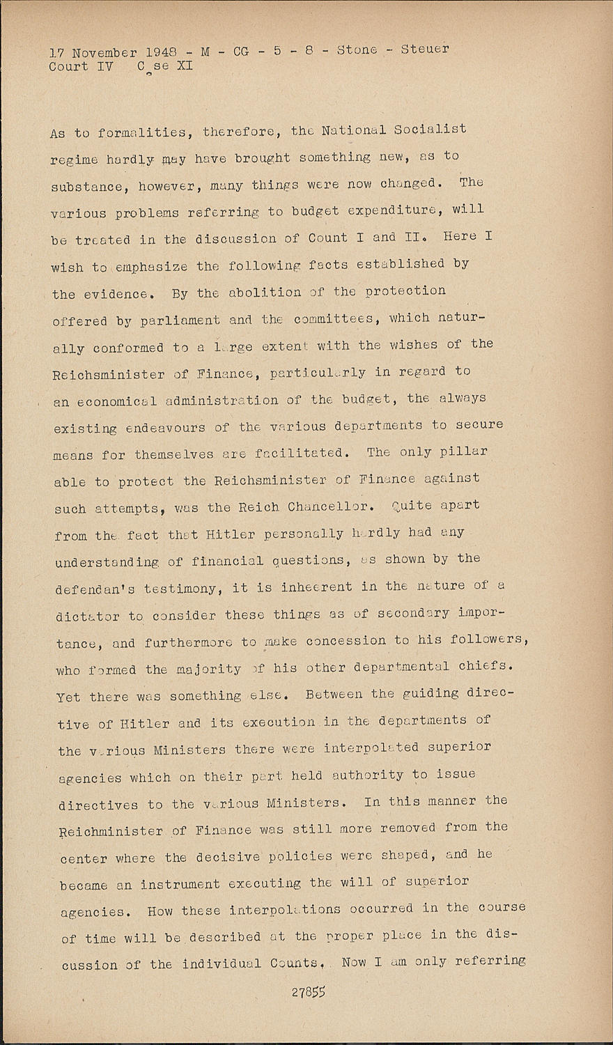 As to formalities, therefore, the National Socialist regime hardly may have brought something new, as to substance, however, many things were now changed. The various problems referring to budget expenditure, will be treated in the discussion of Count I and II. Here I wish to emphasize the following facts established by the evidence. By the abolition of the protection offered by parliament and the committees, which naturally conformed to a large extent with the wishes of the Reichsminister of Finance, particularly in regard to an economical administration of the budget, the always existing endeavours of the various departments to secure means for themselves are facilitated. The only pillar able to protect the Reichsminister of Finance against such attempts, was the Reich Chancellor. Quite apart from the fact that Hitler personally hardly had any understanding of financial questions, as shown by the defendan's testimony, it is inheerent in the nature of a dictator to consider these things as of secondary importance, and furthermore to make concession to his followers, who formed the majority of his other departmental chiefs. Yet there was something else. Between the guiding directive of Hitler and its execution in the departments of the various Ministers there were interpolated superior agencies which on their part held authority to issue directives to the various Ministers. In this manner the Reichminister of Finance was still more removed from the center where the decisive policies were shaped, and he became an instrument executing the will of superior agencies. How these interpolations occurred in the course of time will be described at the proper place in the discussion of the individual Counts. Now I urn only referring to the various agencies, for example the Commissioner for the Four-Year Plan, the Ministerial Council for Reich Defense, and the several Plenipotentiaries General.