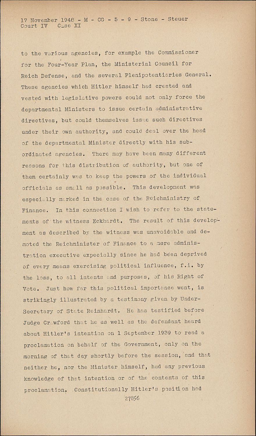 These agencies which Hitler himself had created and vested with legislative powers could not only force the departmental Ministers to issue certain administrative directives, but could themselves issue such directives under their own authority, and could deal over the head of the departmental Minister directly with his subordinated agencies. There may have been many different reasons for this distribution of authority, but one of them certainly was to keep the powers of the individual officials as smell as possible. This development was especially marked in the case of the Reichministry of Finance. In this connection I wish to refer to the statements of the witness Eckhardt. The result of this development as described by the witness was unavoidable and demoted the Reichminister of Finance to a mere administration executive expecially since he had been deprived of every means exercising political influence, f.i. by the loss, to all intents and purposes, of his Right of Vote. Just how far this political importance went, is strikingly illustrated by a testimony given by Undersecretary of State Reinhardt. He has testified before Judge Crawford that he as well as the defendant heard about Hitler's intention on 1 September 1939 to read a proclamation on behalf of the Government, only on the morning of that day shortly before the session, and that neither he, nor the Minister himself, had any previous knowledge of that intention or of the contents of this proclamation. Constitutionally Hitler's position had such that he united in his hand alone the whole authority of the state - as the IMT found in its Judgment -- and that in this way the Ministers, particularly those of non-political departments, had become more chiefs of administration.