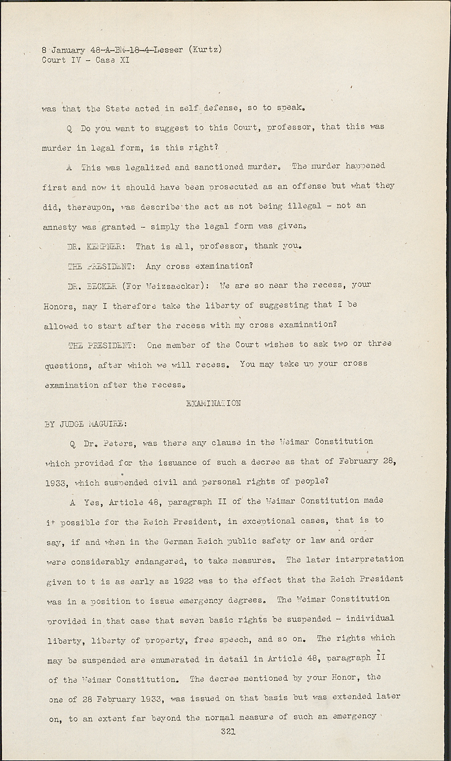 Q.I don't want to enter into the details of this law in order to save time. Now, of course, you know that many teachers of Constitutional law in Germany and particularly representatives, those of the Weimar time, draw a certain line under 1933 and state that then an authoritarian regime started with a number of democratic and Constitutional rights which, as you yourself stated were considerably undermined. This regime was accepted, and after 1933 the authoritarian regeme was completely carried out.
