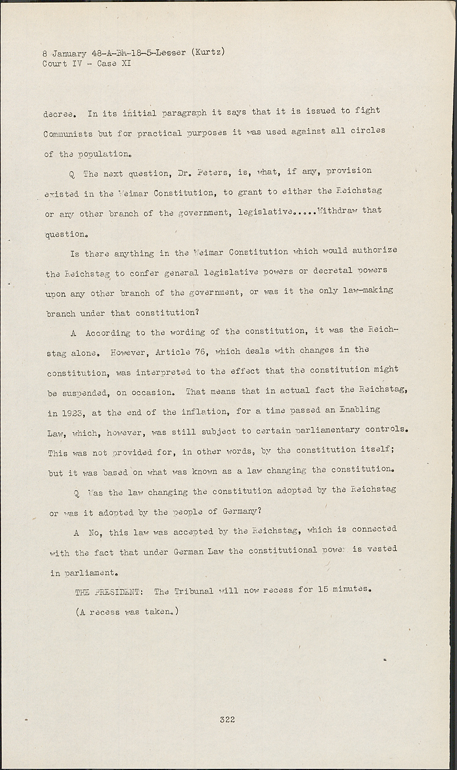QThe next question, Dr. Peters, is, what, if any, provision existed in the Weimar Constitution, to grant to either the Reichstag or any other branch of the government, legislative.....Withdraw that question.