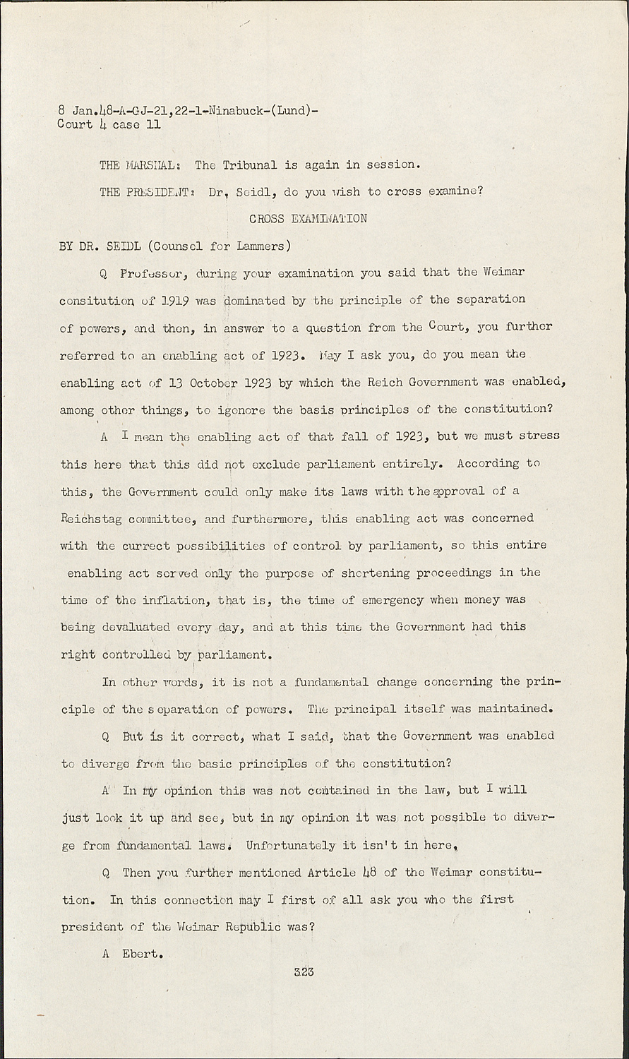 QProfessor, during your examination you said that the Weimar consitution of 1919 was dominated by the principle of the separation of powers, and then, in answer to a question from the Court, you further referred to an enabling act of 1923. May I ask you, do you mean the enabling act of 13 October 1923 by which the Reich Government was enabled, among other things, to igonore the basis principles of the constitution?