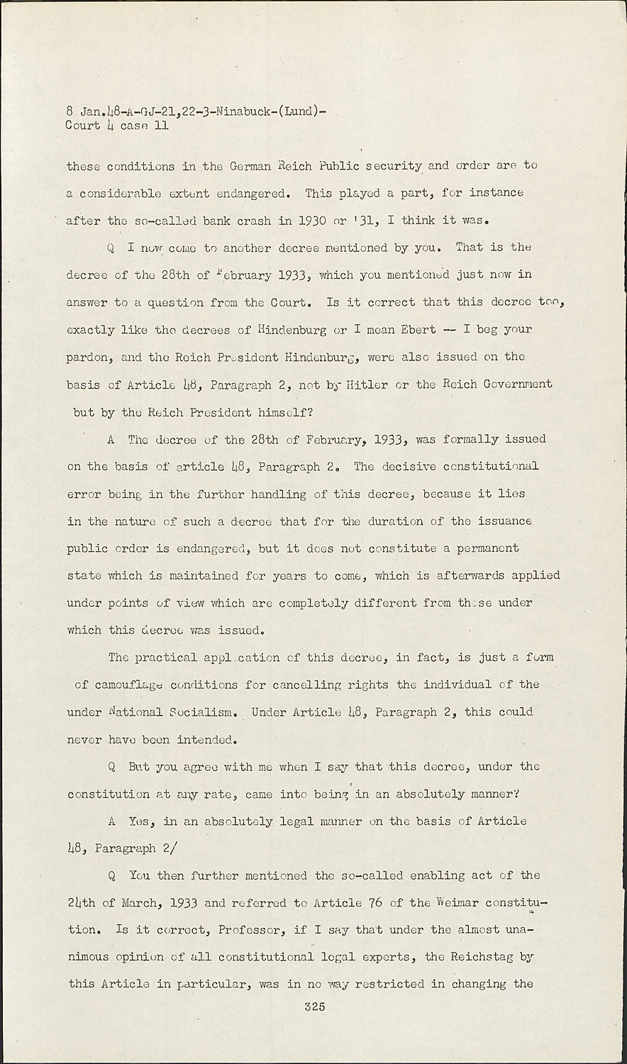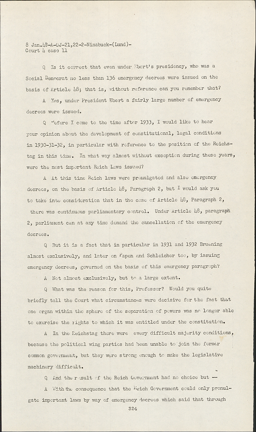 AAt this time Reich laws were promulgated and also emergency decrees, on the basis of Article 48, Paragraph 2, but I would ask you to take into consideration that in the case of Article 48, Paragraph 2, there was continuous parliamentary control.