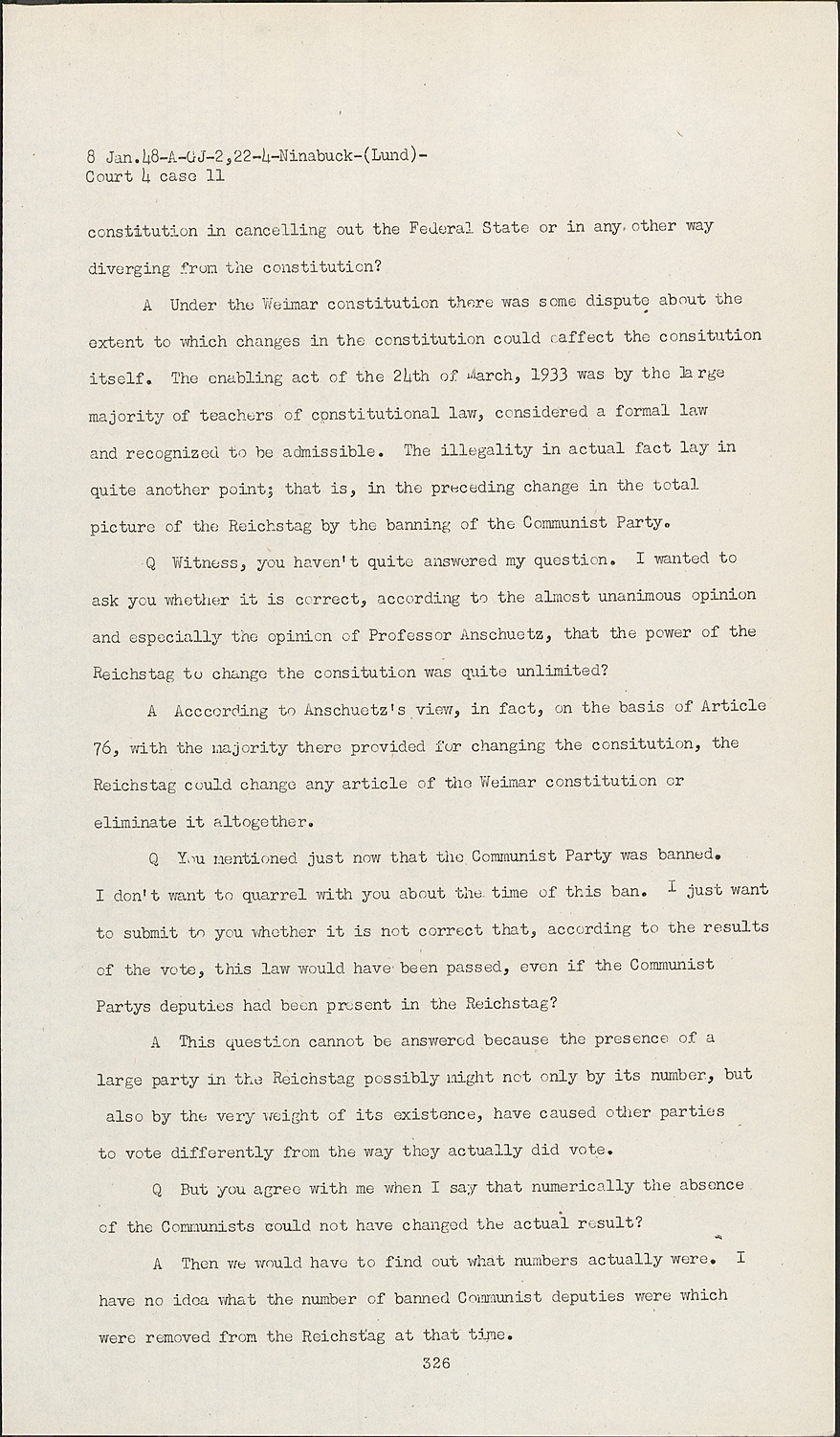 QYou then further mentioned the so-called enabling act of the 24th of March, 1933 and referred to Article 76 of the Weimar constitution. Is it correct, Professor, if I say that under the almost unanimous opinion of all constitutional legal experts, the Reichstag by this Article in particular, was in no way restricted in changing the constitution in cancelling out the Federal State or in any other way diverging from the constitution?