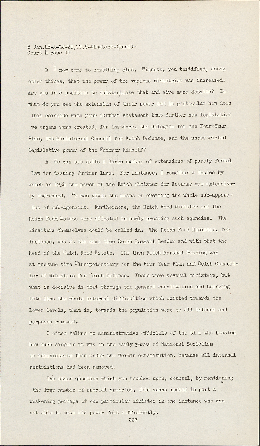 QI now come to something else. Witness, you testified, among other things, that the power of the various ministries was increased. Are you in a position to substantiate that and give more details? In what do you see the extension of their power and in particular how does this coincide with your further statement that further new legislation ve organs were created, for instance, the delegate for the Four Year Plan, the Ministerial Council for Reich Defense, and the unrestricted legislative power of the Fuehrer himself?