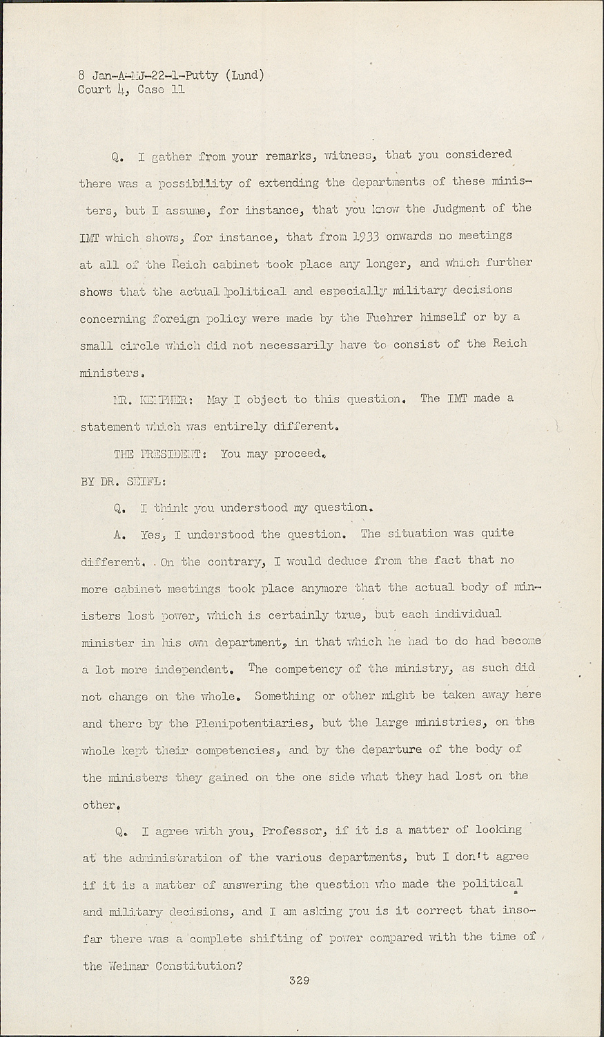 Q.I agree with you, Professor, if it is a matter of looking at the administration of the various departments, but I don't agree if it is a matter of answering the question who made the political and military decisions, and I am asking you is it correct that insofar there was a complete shifting of power compared with the time of the Weimar Constitution?
