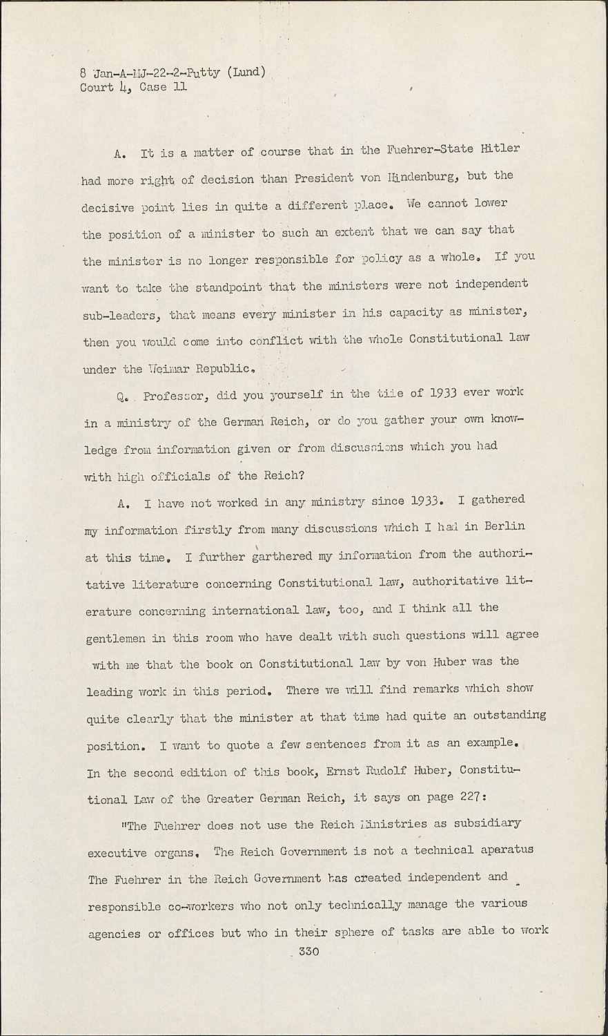 A.I have not worked in any ministry since 1933. I gathered my information firstly from many discussions which I had in Berlin at this time. I further garthered my information from the authoritative literature concerning Constitutional law, authoritative literature concerning international law, too, and I think all the gentlemen in this room who have dealt with such questions will agree with me that the book on Constitutional law by von Huber was the leading work in this period.