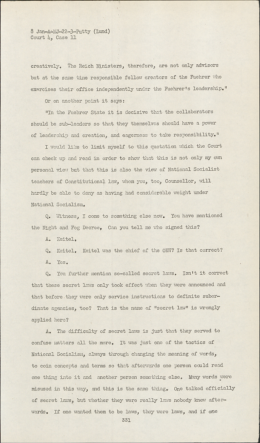 A.The difficulty of secret laws is just that they served to confuse matters all the more. It was just one of the tactics of National Socialism, always through changing the meaning of words, to coin concepts and terms so that afterwards one person could read one thing into it and another person something else. Many words were misused in this way, and this is the same thing. One talked officially of secret laws, but whether they were really laws nobody knew afterwards. If one wanted them to be laws, they were laws, and if one didn't want to use them, one said they weren't, but the whole question of secret laws is exactly the same as in the case of the Night and Fog Decree.