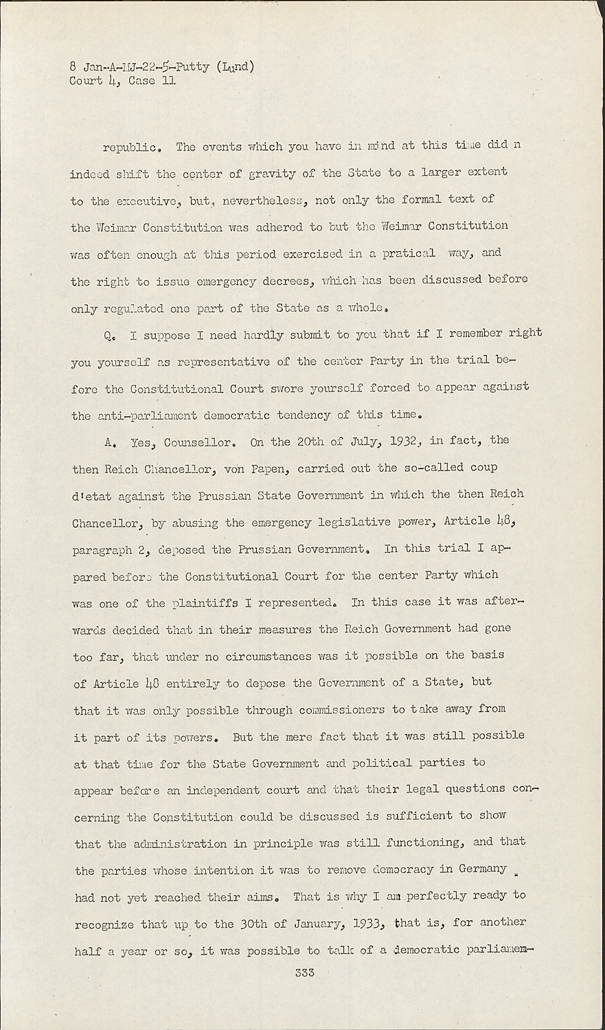 A.Yes, Counsellor. On the 20th of July, 1932, in fact, the then Reich Chancellor, von Papen, carried out the so-called coup d'etat against the Prussian State Government in which the then Reich Chancellor, by abusing the emergency legislative power, Article 48, paragraph 2, deposed the Prussian Government. In this trial I appared before the Constitutional Court for the center Party which was one of the plaintiffs I represented. In this case it was afterwards decided that in their measures the Reich Government had gone too far, that under no circumstances was it possible on the basis of Article 48 entirely to depose the Government of a State, but that it was only possible through commissioners to take away from it part of its powers. But the mere fact that it was still possible at that time for the State Government and political parties to appear before an independent court and that their legal questions concerning the Constitution could be discussed is sufficient to show that the administration in principle was still functioning, and that the parties whose intention it was to remove democracy in Germany had not yet reached their aims. That is why I am perfectly ready to recognize that up to the 30th of January, 1933, that is, for another half a year or so, it was possible to talk of a democratic parliament ary republican form of government in Germany.