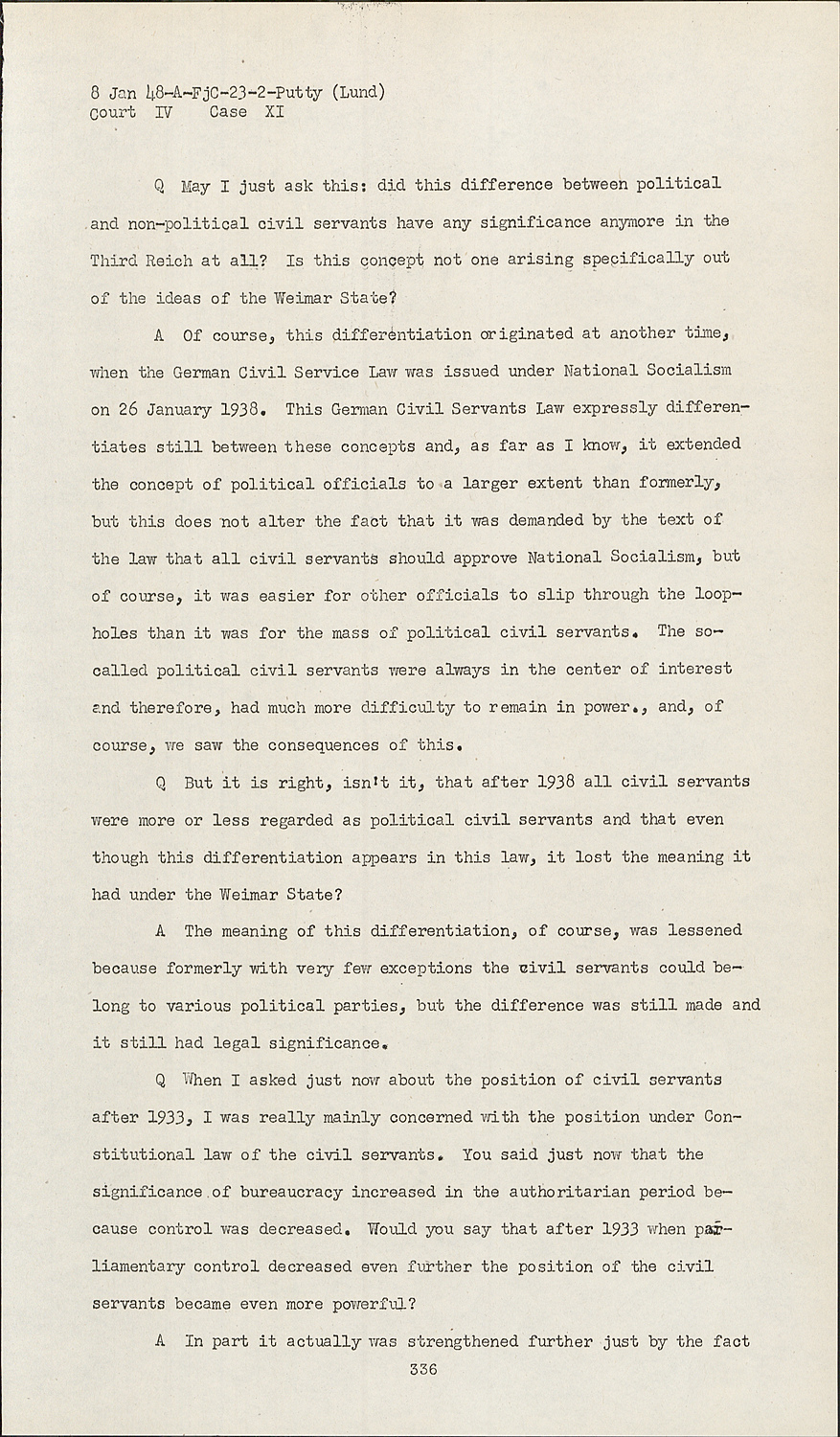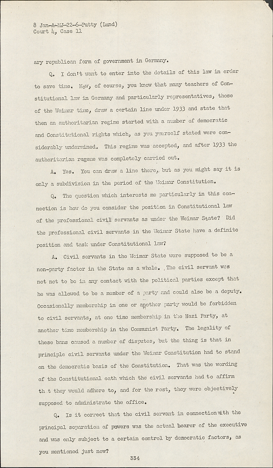 Q.The question which interests me particularly in this connection is how do you consider the position in Constitutional law of the professional civil servants as under the Weimar State? Did the professional civil servants in the Weimar State have a definite position and task under Constitutional law?