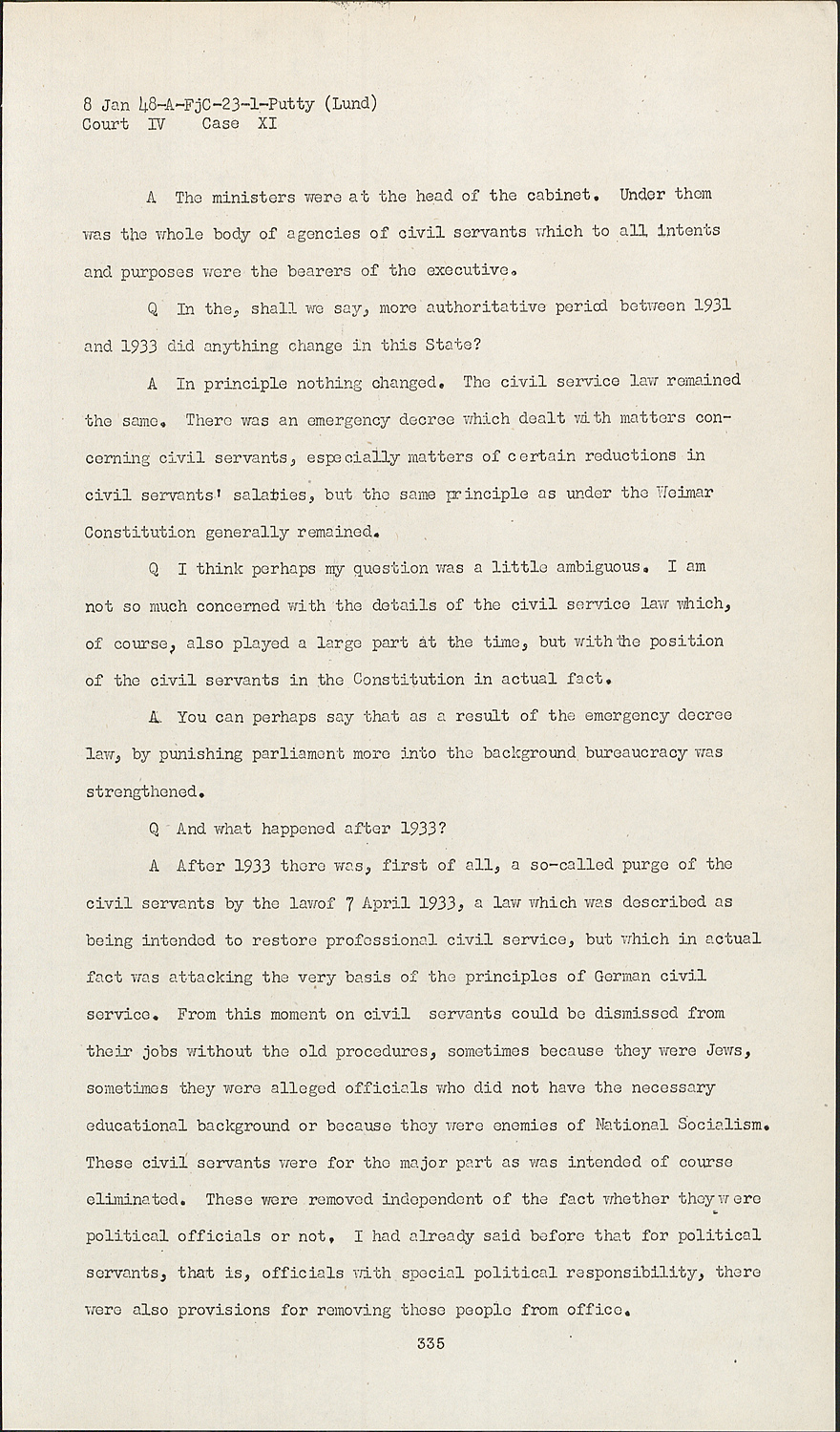 AAfter 1933 there was, first of all, a so-called purge of the civil servants by the lawof 7 April 1933, a law which was described as being intended to restore professional civil service, but which in actual fact was attacking the very basis of the principles of German civil service. From this moment on civil servants could be dismissed from their jobs without the old procedures, sometimes because they were Jews, sometimes they were alleged officials who did not have the necessary educational background or because they were enemies of National Socialism. These civil servants were for the major part as was intended of course eliminated. These were removed independent of the fact whether they were political officials or not, I had already said before that for political servants, that is, officials with special political responsibility, there were also provisions for removing these people from office.