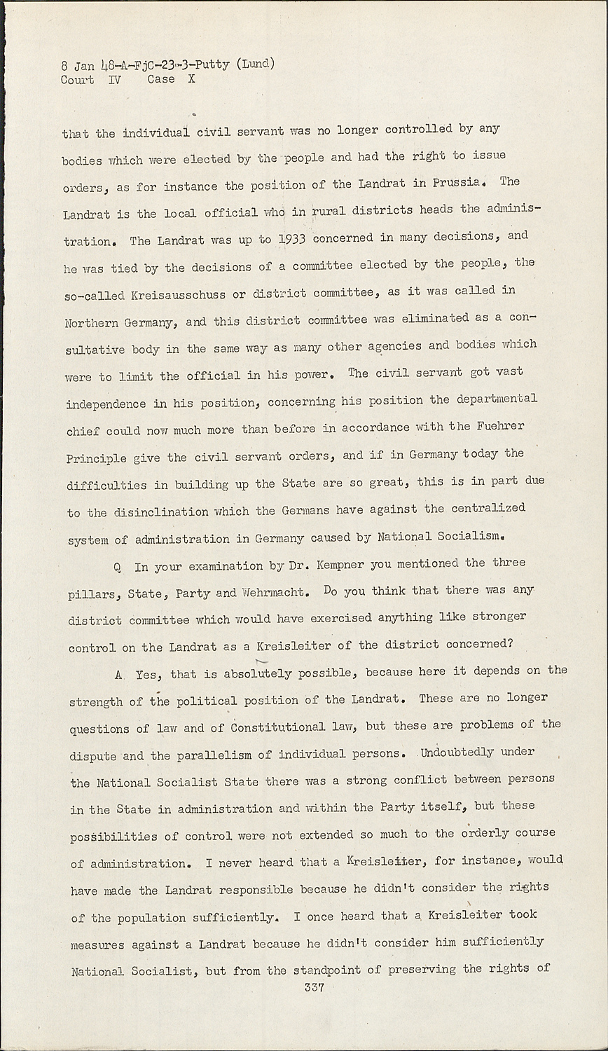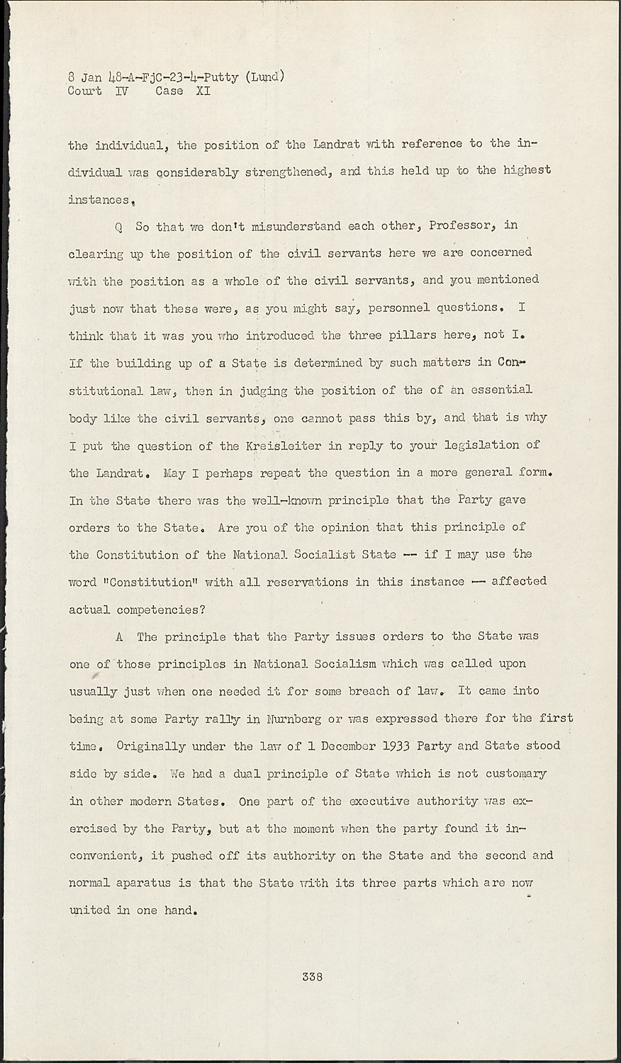 QSo that we don't misunderstand each other, Professor, in clearing up the position of the civil servants here we are concerned with the position as a whole of the civil servants, and you mentioned just now that these were, as you might say, personnel questions. I think that it was you who introduced the three pillars here, not I. If the building up of a State is determined by such matters in Constitutional law, then in judging the position of the of an essential body like the civil servants, one cannot pass this by, and that is why I put the question of the Kreisleiter in reply to your legislation of the Landrat. May I perhaps repeat the question in a more general form. In the State there was the well-known principle that the Party gave orders to the State. Are you of the opinion that this principle of the Constitution of the National Socialist State -- if I may use the word "Constitution" with all reservations in this instance -- affected actual competencies?