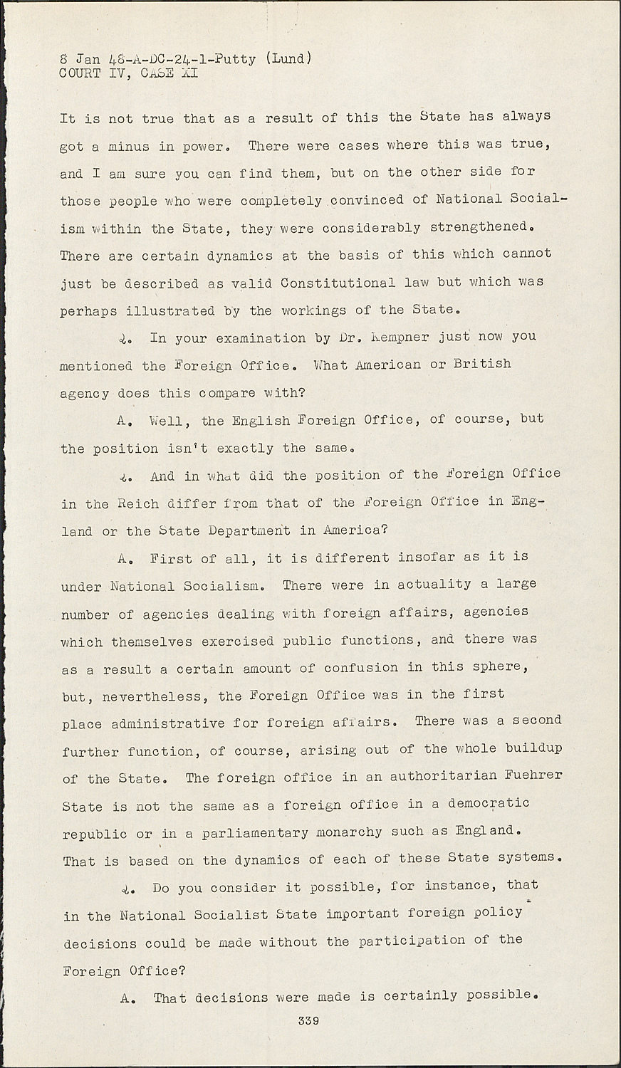 A.First of all, it is different insofar as it is under National Socialism. There were in actuality a large number of agencies dealing with foreign affairs, agencies which themselves exercised public functions, and there was as a result a certain amount of confusion in this sphere, but, nevertheless, the Foreign Office was in the first place administrative for foreign affairs. There was a second further function, of course, arising out of the whole buildup of the State. The foreign office in an authoritarian Fuehrer State is not the same as a foreign office in a democratic republic or in a parliamentary monarchy such as England. That is based on the dynamics of each of these State systems.