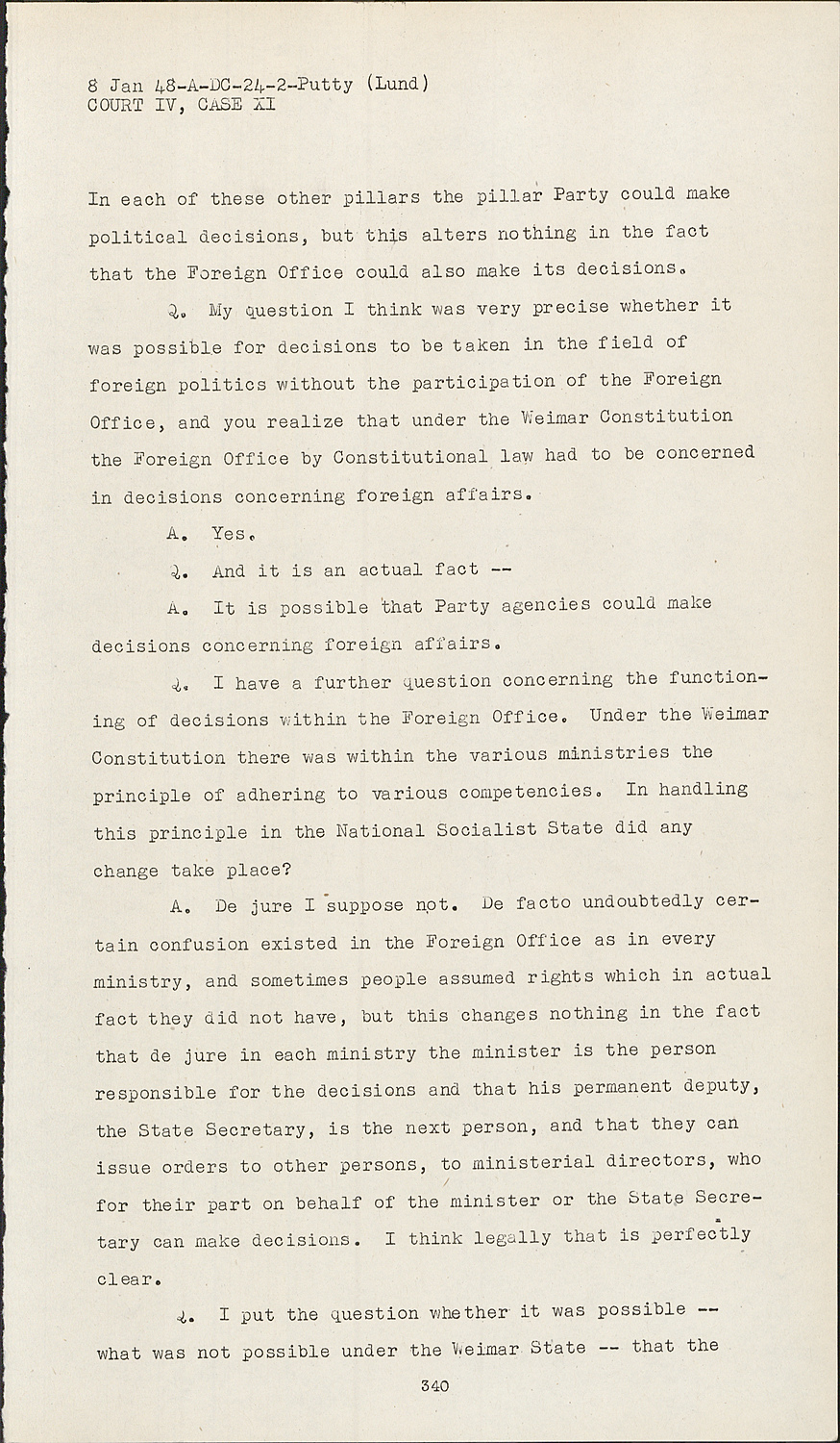 Q.My question I think was very precise whether it was possible for decisions to be taken in the field of foreign politics without the participation of the Foreign Office, and you realize that under the Weimar Constitution the Foreign Office by Constitutional law had to be concerned in decisions concerning foreign affairs.