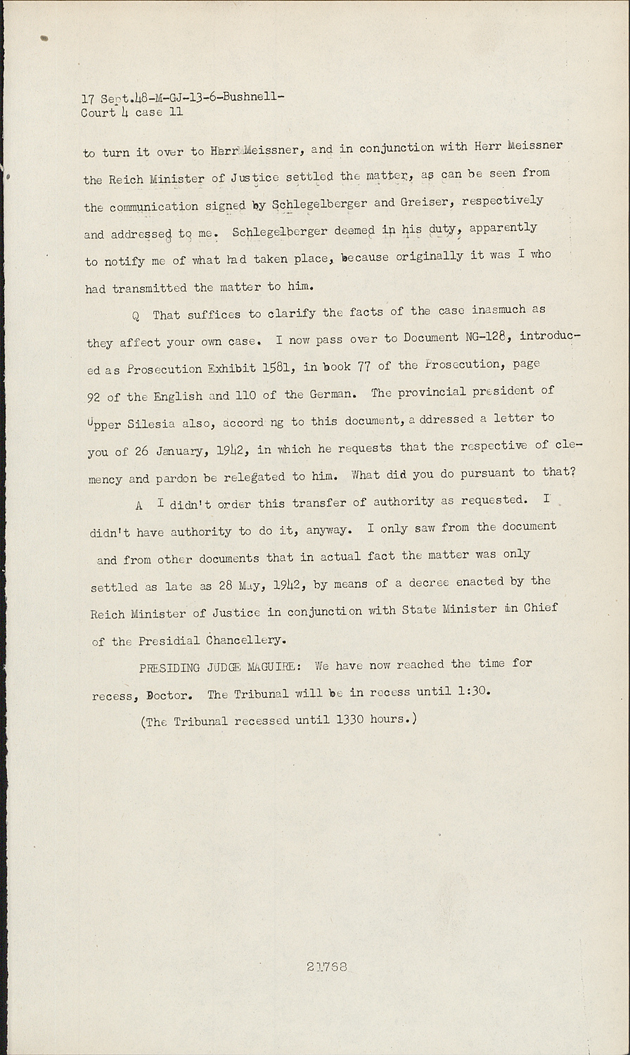 PRESIDING JUDGE MAGUIRE:We have now reached the time for recess, Doctor. The Tribunal will be in recess until 1:30.