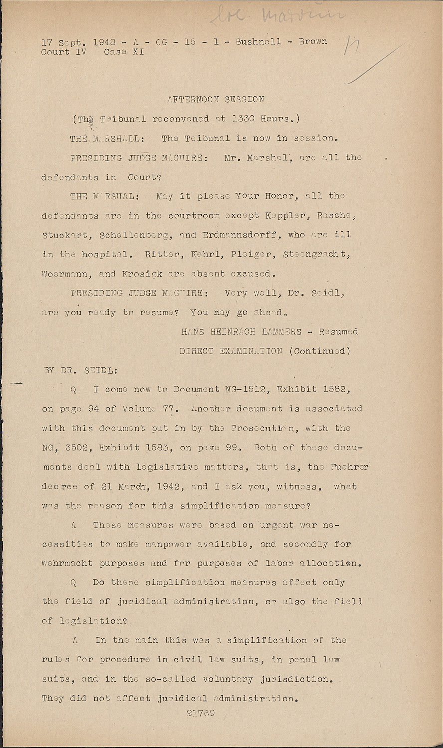 QI come now to Document NG-1512, Exhibit 1582, on page 94 of Volume 77. Another document is associated with this document put in by the Prosecution, with the NG, 3502, Exhibit 1583, on page 99. Both of these documents deal with legislative matters, that is, the Fuehrer decree of 21 March, 1942, and I ask you, witness, what was the reason for this simplification measure?