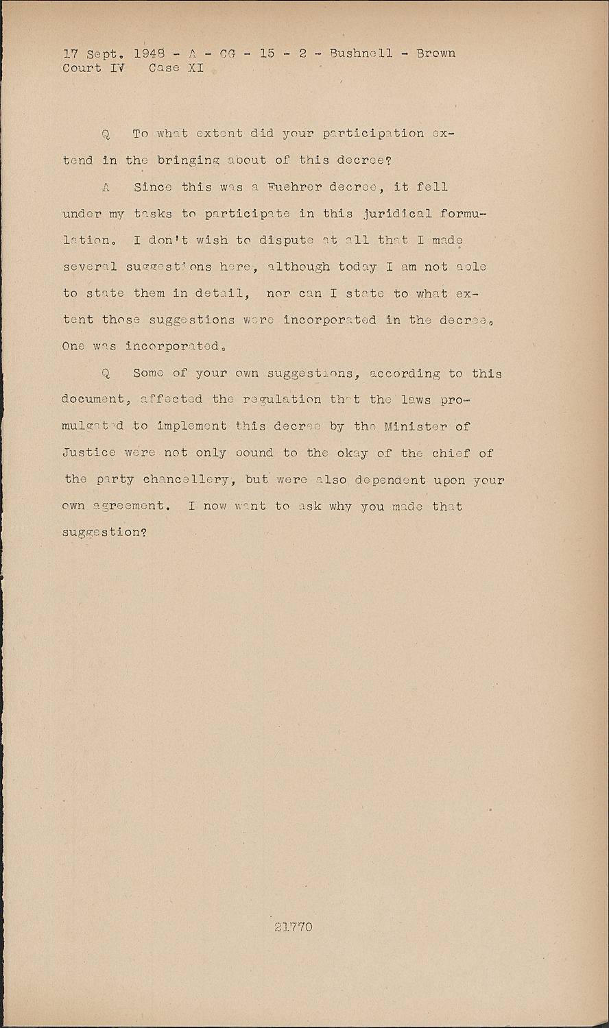 ASince this was a Fuehrer decree, it fell under my tasks to participate in this juridical formulation. I don't wish to dispute at all that I made several suggestions hare, although today I am not solo to state them in detail, nor can I state to what extent those suggestions were incorporated in the decree. One was incorporated.