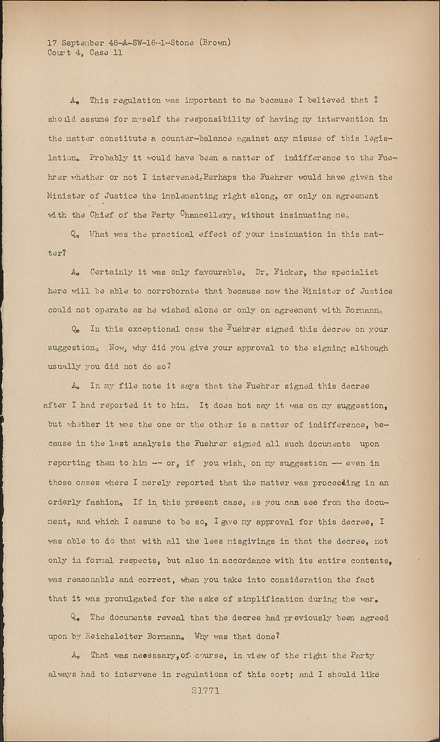 QSome of your own suggestions, according to this document, affected the regulation that the laws promulgated to implement this decree by the Minister of Justice were not only oound to the okay of the chief of the party chancellory, but were also dependent upon your own agreement. I now want to ask why you made that suggestion?