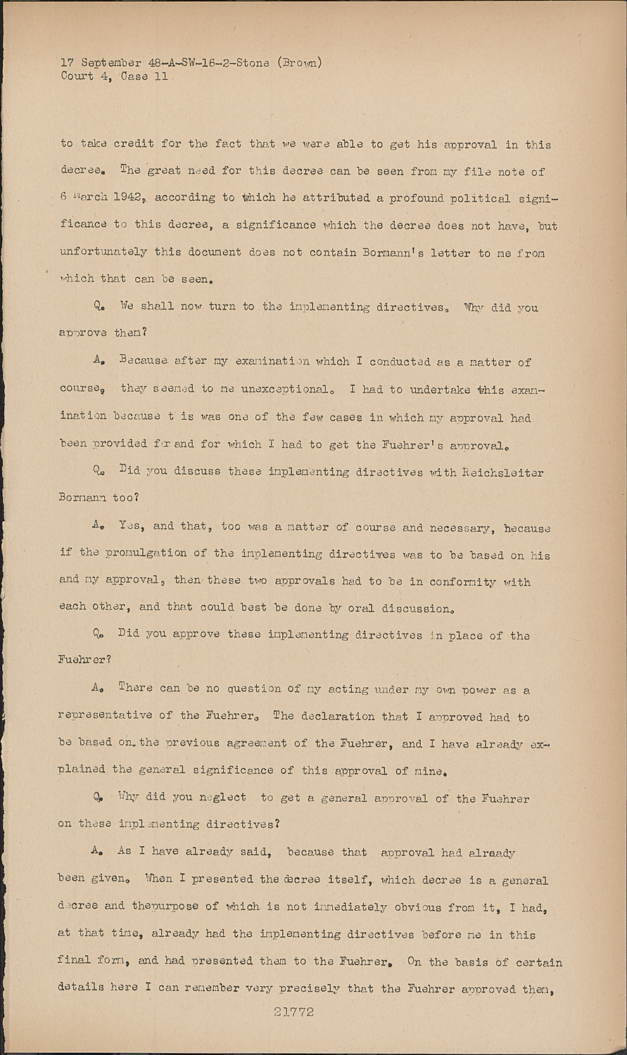 A.As I have already said, because that approval had already been given. When I presented the decree itself, which decree is a general decree and thepurpose of which is not immediately obvious from it, I had, at that time, already had the implementing directives before me in this final form, and had presented them to the Fuehrer. On the basis of certain details here I can remember very precisely that the Fuehrer approved them.