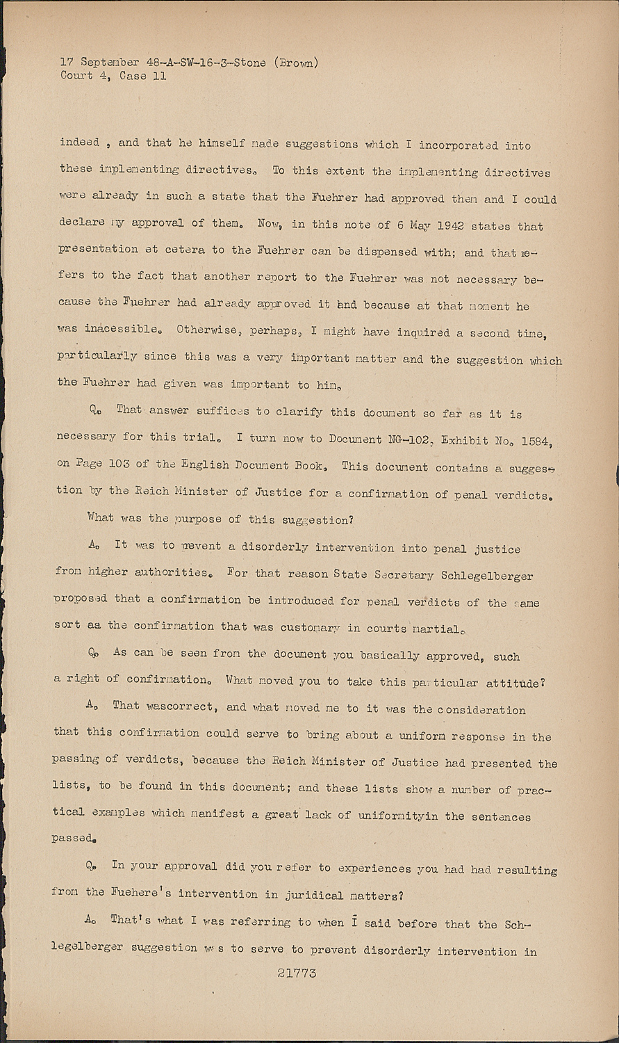 Q.That answer suffices to clarify this document so far as it is necessary for this trial. I turn now to Document NG-102, Exhibit No. 1584, on Page 103 of the English Document Book. This document contains a suggestion by the Reich Minister of Justice for a confirmation of penal verdicts.
