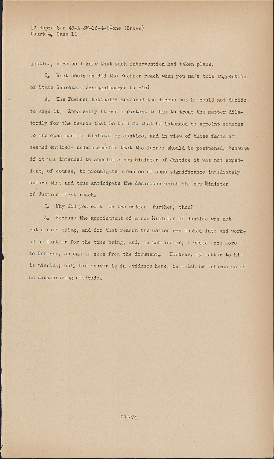 A.Because the appointment of a new Minister of Justice was not yet a sure thing, and for that reason the matter was looked into and worked on further for the time being; and, in particular, I wrote once more to Bormann, as can be seen from the document. However, my letter to him is missing; only his answer is in evidence here, in which he informs me of us disapproving attitude.