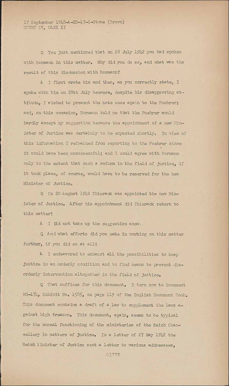 QThat suffices for this document. I turn now to Document NG-174, Exhibit No. 1585, on page 119 of the English Document Book. This document contains a draft of a law to supplement the laws against high treason. This document, again, seems to be typical for the normal functioning of the ministeries of the Reich Chancellery in matters of justice. In a letter of 27 May 1942 the Reich Minister of Justice sent a letter to various addressees, one of which is you, with the preliminary draft for the law he intended, with the request that you approve it.