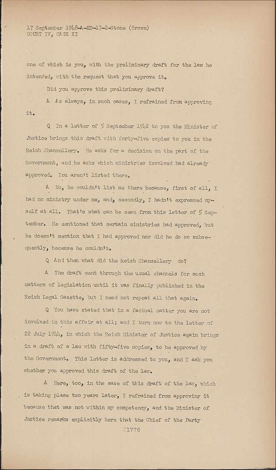 QYou have stated that in a factual matter you are not involved in this affair at all; and I turn now to the letter of 22 July 1944, in which the Reich Minister of Justice again brings in a draft of a law with fifty-five copies, to be approved by the Government. This letter is addressed to you, and I ask you whether you approved this draft of the law.