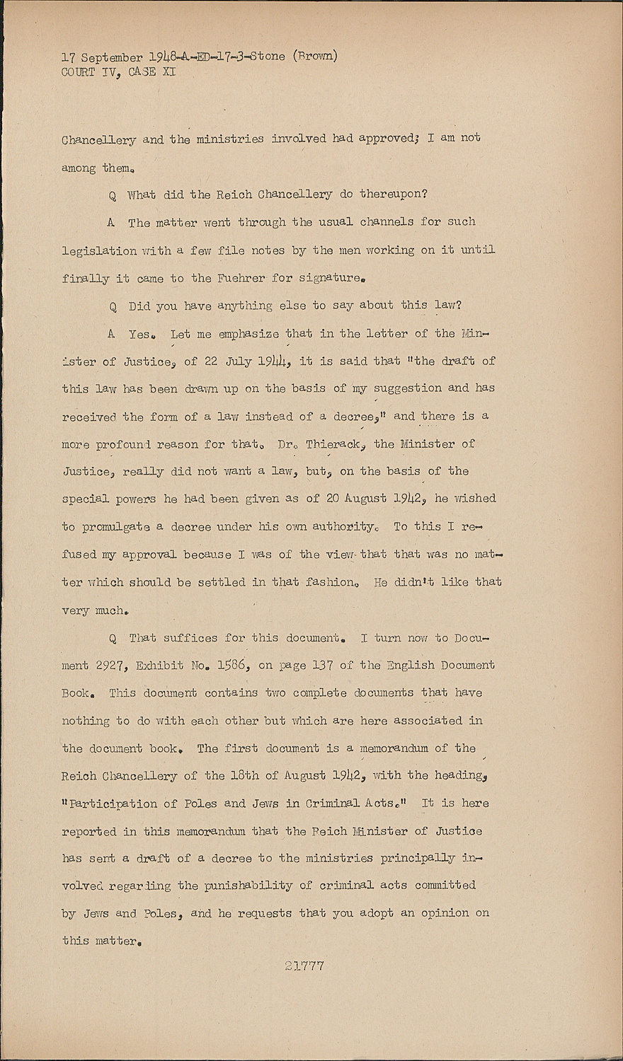 QThat suffices for this document. I turn now to Document 2927, Exhibit No. 1586, on page 137 of the English Document Book. This document contains two complete documents that have nothing to do with each other but which are here associated in the document book. The first document is a memorandum of the Reich Chancellery of the 18th of August 1942, with the heading, "Participation of Poles and Jews in Criminal Acts." It is here reported in this memorandum that the Reich Minister of Justice has sent a draft of a decree to the ministries principally involved regarding the punishability of criminal acts committed by Jews and Poles, and he requests that you adopt an opinion on this matter.