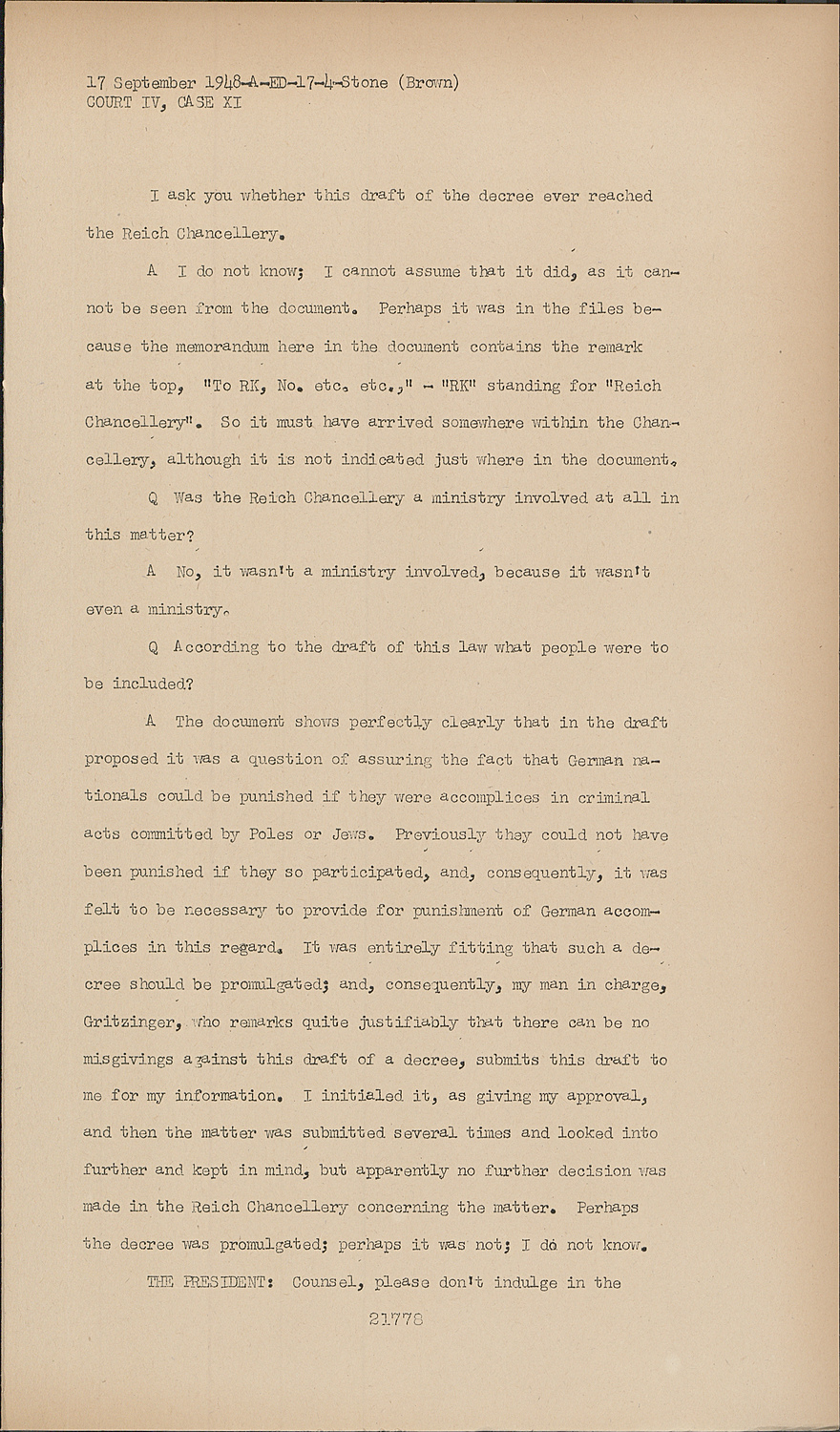 AThe document shows perfectly clearly that in the draft proposed it was a question of assuring the fact that German nationals could be punished if they were accomplices in criminal acts committed by Poles or Jews. Previously they could not have been punished if they so participated, and, consequently, it was felt to be necessary to provide for punishment of German accomplices in this regard. It was entirely fitting that such a decree should be promulgated; and, consequently, ray man in charge, Gritzinger, who remarks quite justifiably that there can be no misgivings against this draft of a decree, submits this draft to me for my information. I initialed it, as giving my approval, and then the matter was submitted several times and looked into further and kept in mind, but apparently no further decision was made in the Reich Chancellery concerning the matter. Perhaps the decree was promulgated; perhaps it was not; I do not know.