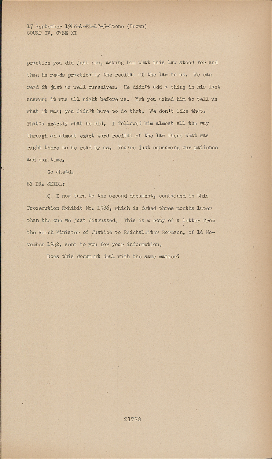 QI now turn to the second document, contained in this Prosecution Exhibit No. 1586, which is dated three months later than the one we just discussed. This is a copy of a letter from the Reich Minister of Justice to Reichsleiter Bormann, of 16 November 1942, sent to you for your information.